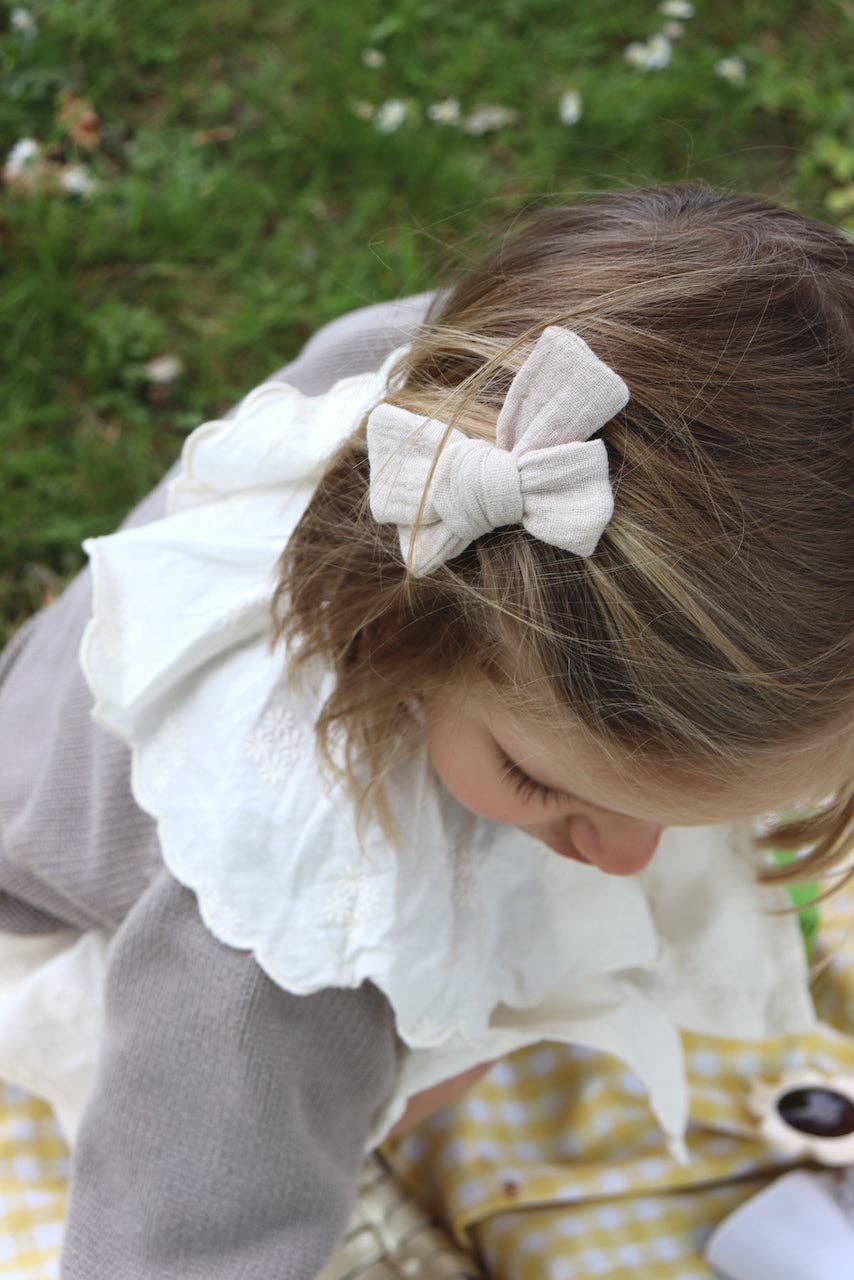 Enkelskikt med en fållad kant Mäter cirka 4,5 ”bred och 5,5 ”lång. Fäst på en alligatorklämma med tänder