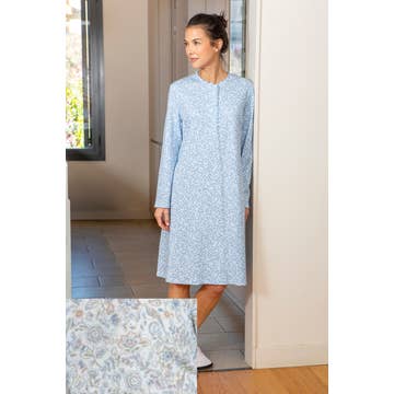 100% Rayon | Dubbel gasväv av bomull | Sidfickor | Blombroderi på livet | Knäppning framtill | Lätt rynk vid midjan | Långa ärmar | Genevieve är 175 cm och bär en nattlinne i storlek small som mäter 127 cm | Maskintvätt på skonsamt program. Häng för att torka. | Stolt tillverkad i Indien
