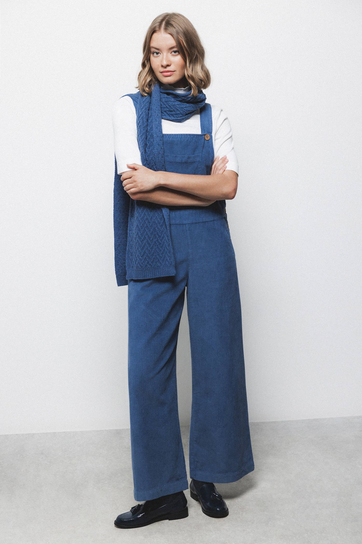Plus size manchesterförkläde/overallklänning ovanför knäet med två stora främre påsydda fickor med klaffstängning och knappdetalj.