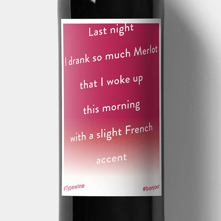 En flaska vin går alltid ner som en gåva — oavsett om det är för födelsedagar eller när du är bjuden över på en måltid. Men hur populärt det än är att ge folk vin är det också ganska ospektakulärt. Med denna Typewine-etikett kan du förvandla en vanlig flaska vin till en riktig iögonfallande present på nolltid. Täck helt enkelt över etiketten på vinflaskan — klar!