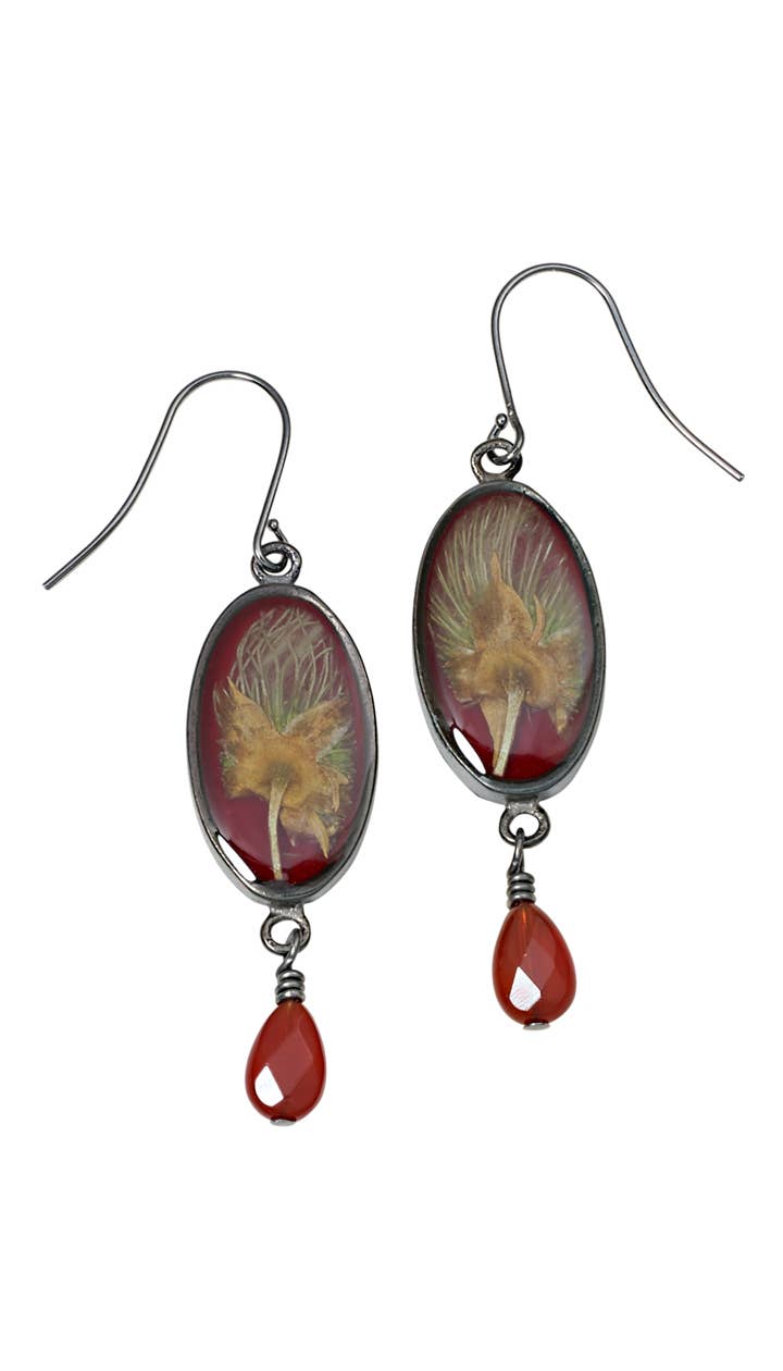 Faktiska vildkattblommor odlade i Himalayabergen i kontrast med en rik gyllengul färg i antikbehandlade mässingspläterade tenninställningar. Varje mittpunkt mäter 3/4". Öronkrokarna är av antik mässing. Dropparna som visas är äkta iolit men kan variera beroende på tillgänglighet.