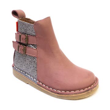 Fog Milo Boot är tillverkad av toppkornigt läder och helt fodrad i andningsbart läder för att transportera bort fukt. Sulan är gjord av hållbart och flexibelt gummi, och strukturen ger flexibel stabilitet utan vikt för att stödja ditt barns tidiga steg. Den handskurna "V"-formen baktill gör det ännu enklare att ta på och av dem. En favorit för stiliga små pojkar och flickor! Rosetter av: The Little Design Co.