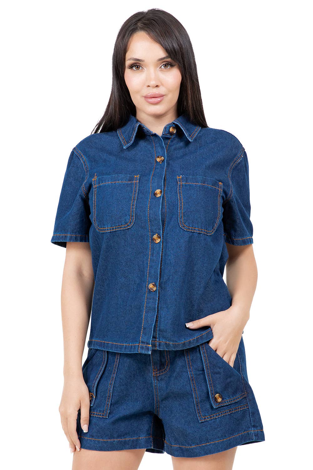 Sexig 2-delad set, Krage halsringning, halv dragkedja fram, långa ärmar, elastisk midja, korta sidofickor Modellstorlek liten 5'6" 35-26-43 Topp Byst 45 tum, Topplängd 25 tum, Byxlängd 13 tum, Midja 25 tum, Höft 40 tum