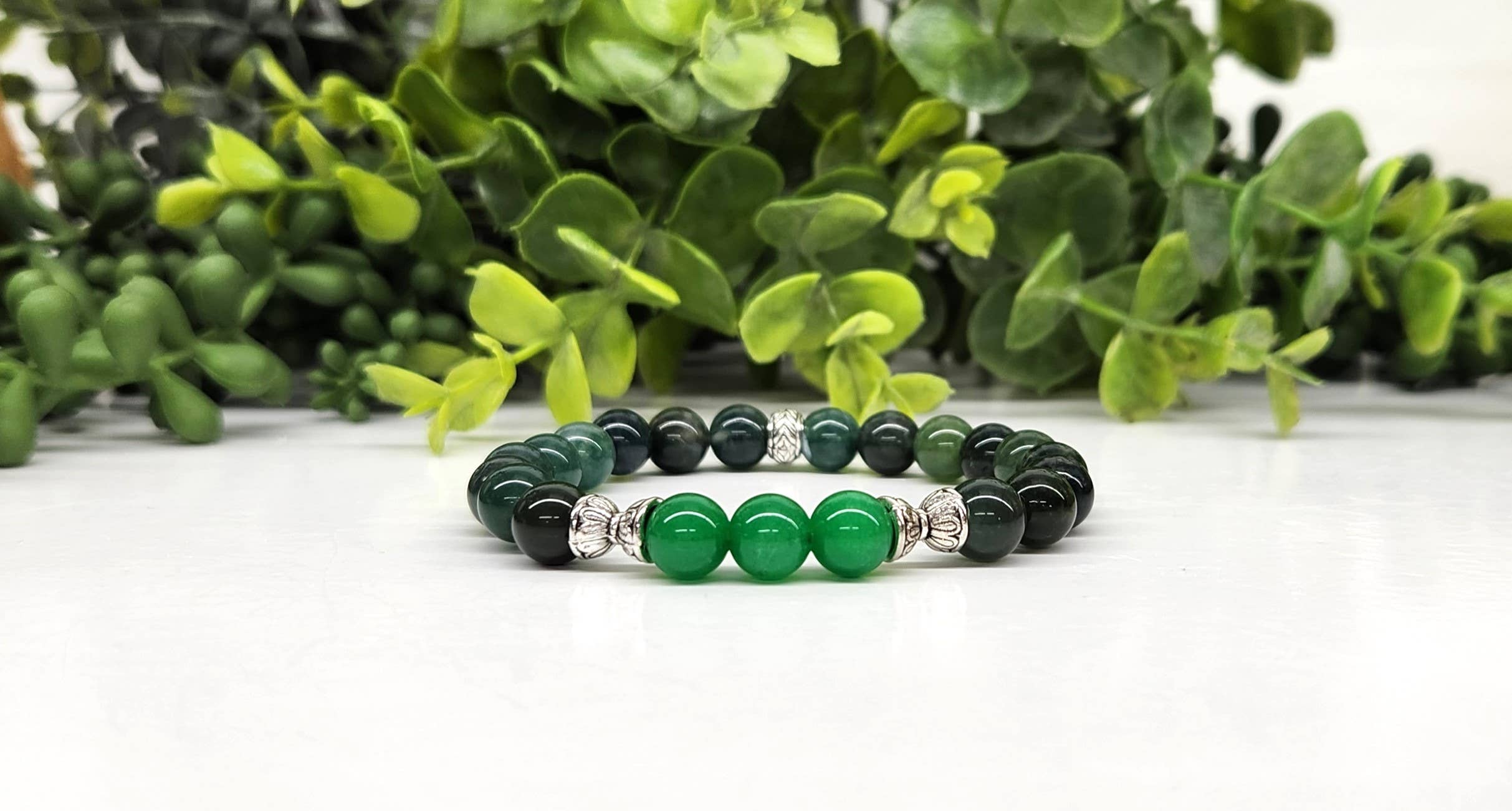ABUNDANCE: Armband med grön jade i centrum och mossagat, dekorerat med silverfärgade metallpärlor. Armbandet är 19 cm långt och dubbelt trätt för extra hållbarhet. Alla stenar är naturliga halvädelstenar. Bilden visar typen och kvaliteten på stenarna du kommer att få. Observera att det kan förekomma små variationer på grund av stenarnas naturliga karaktär.