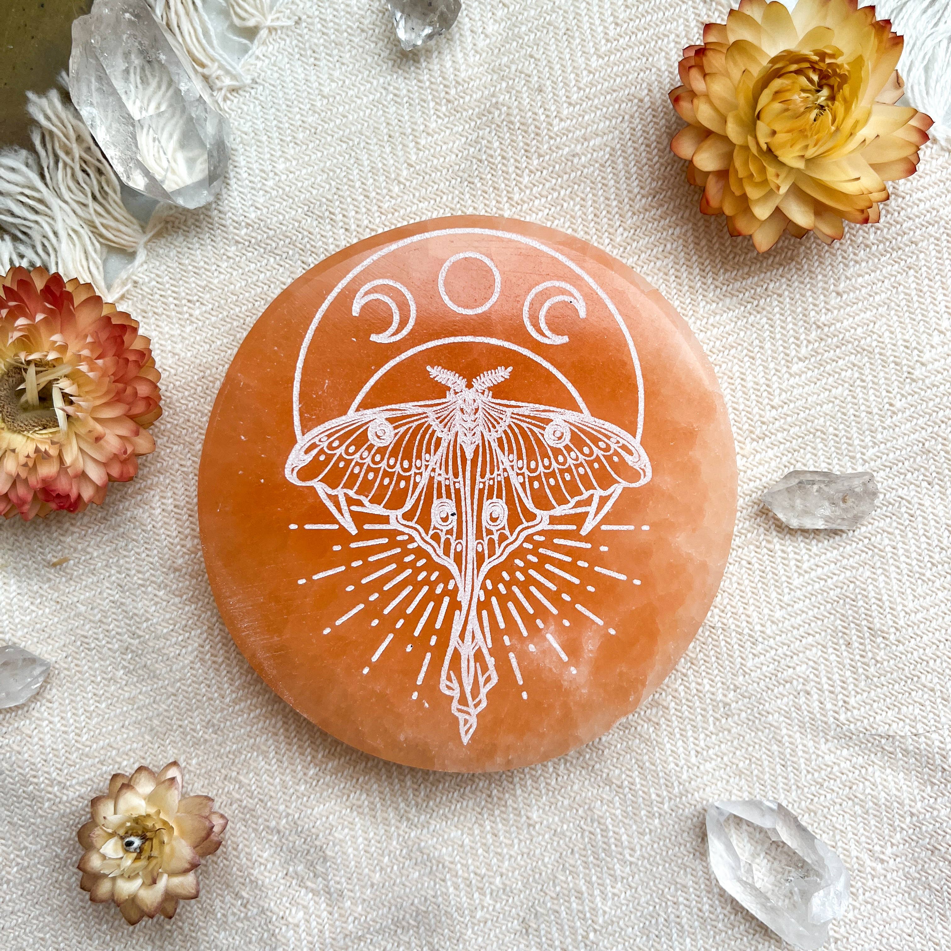 Vi presenterar vår nya Celestial Snake selenitkristallladdning och rengöringsplatta. Vår Selenite Crystal Charging Plate är tillverkad med naturlig skönhet och är tillverkad av högkvalitativ, ren vit eller persika selenitsten. Som ett kristallgaller eller platta utstrålar det positiv energi och skapar en lugnande atmosfär. Det är en perfekt present till alla som älskar naturstenar, kristallgaller. Selenite Crystal Charging Plate är inte bara en dekorativ bit; det är också ett kraftfullt verktyg som kan hjälpa till att ladda och rengöra andra kristaller. Dess unika egenskaper förstärker och renar energin från alla andra kristaller som placeras på den. Designen är vackert graverad på Selenite Crystal Charging Plate, vilket gör den till ett iögonfallande och elegant tillskott till din Halloween-, höst- eller Spooky Season-dekor.