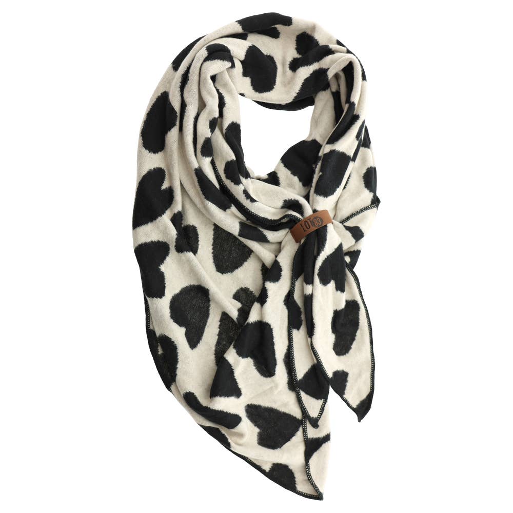 Den vackra, tvåfärgade triangelhalsduken Luna har ett motiv med färgade hjärtan. Denna vackra finstickade halsduk med 38% bomull är underbart mjuk och skön att bära. Denna halsduk har också en vegansk läderrem som du kan knyta halsduken med.