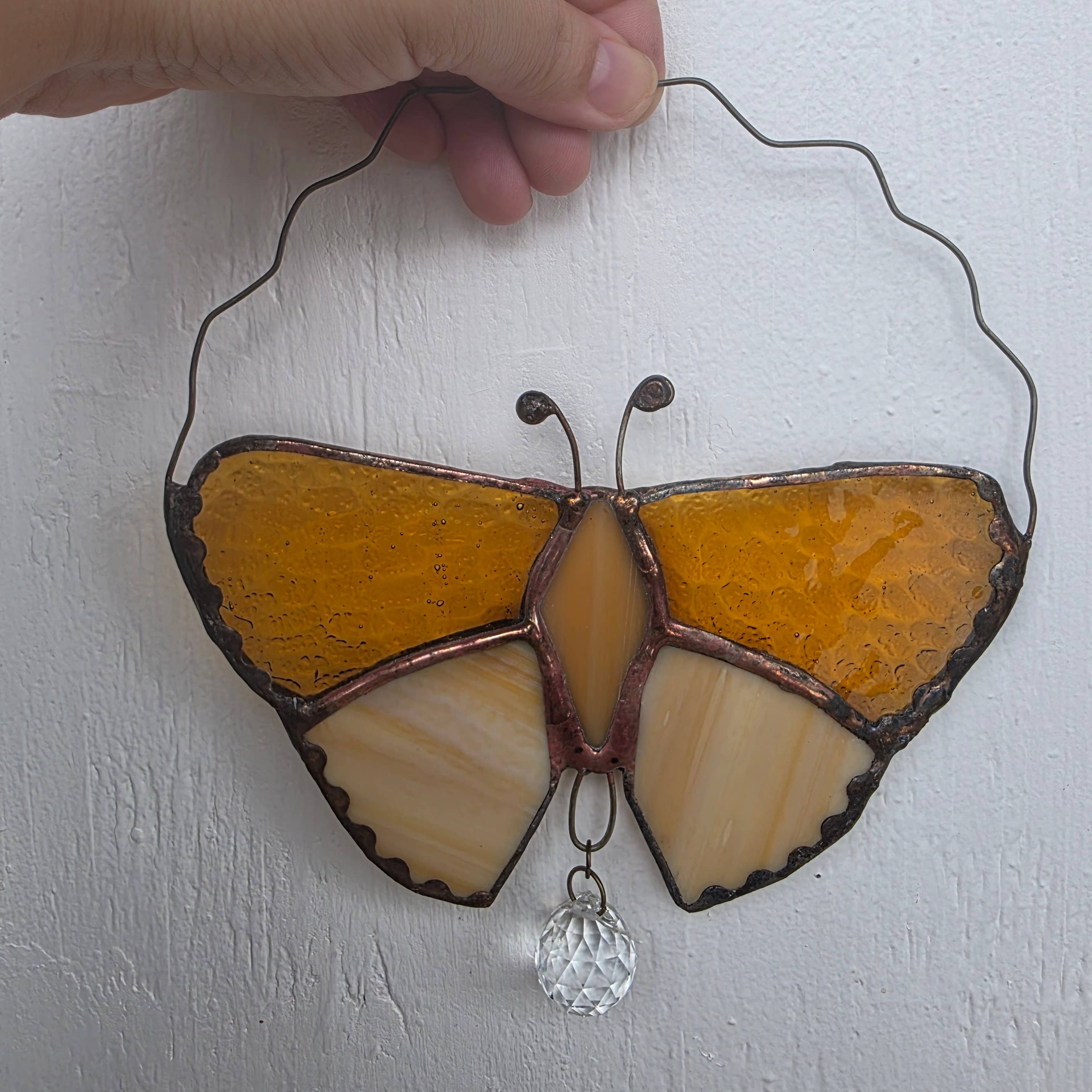 Supersöt heminredning innehöll en 3-dimensionell triangel i målat glas - ditt val av färg! Inkluderar ett disco kristallprisma som också bryter ljus. Tillverkad med blyfri lödning - med en pistolmetallpatina Mått: 1 ”x 3,5" glaspaneler Alla alternativ av glas är klara eller texturerade klara, förutom spegel (insidan är spegel, utsidan är svart patina) och klar vit virvel som är delvis klar.