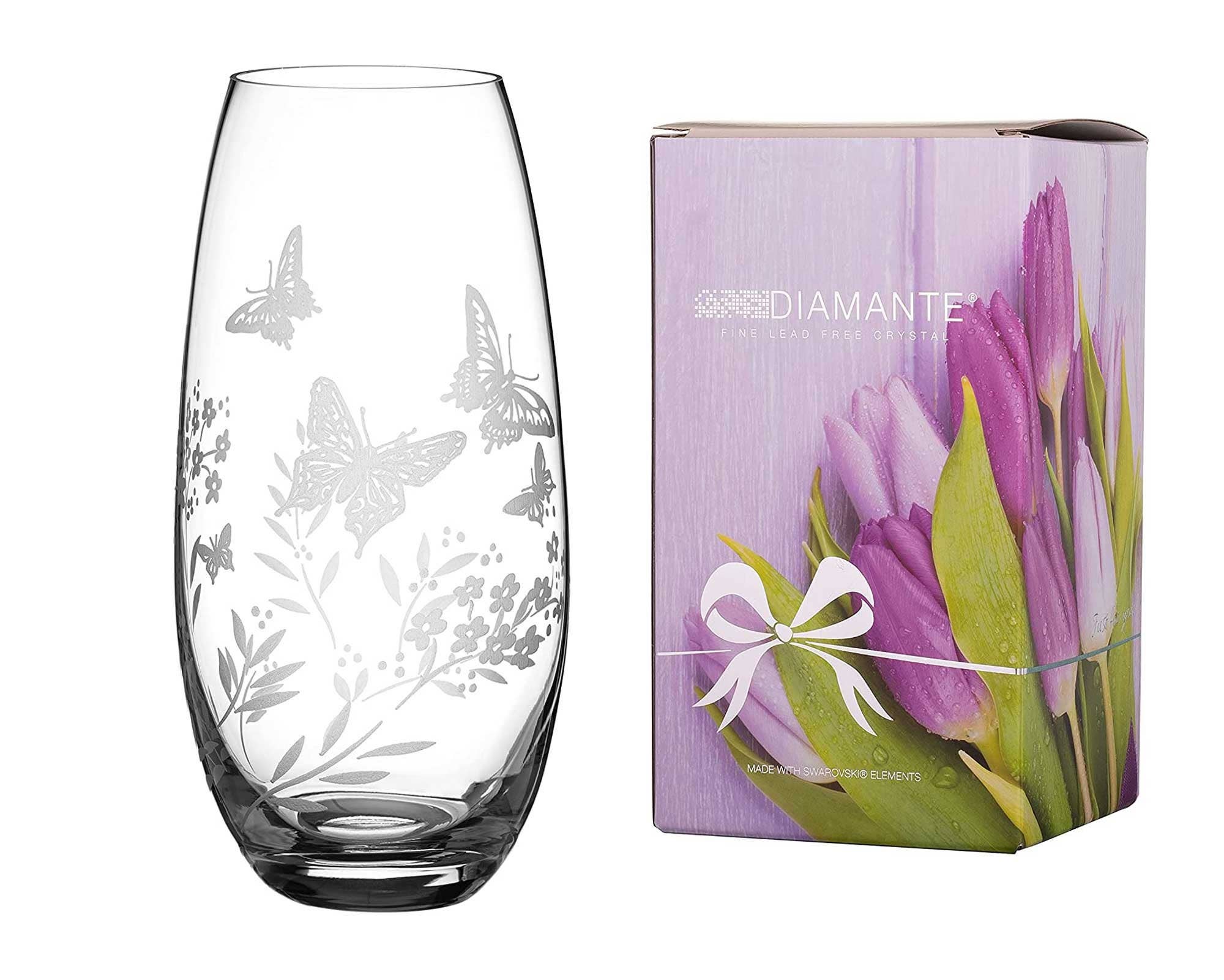 Handskärning med en vacker hjärtdesign Utsmyckad med Swarovski kristaller Förpackad i en premiumpresentförpackning Tillverkad i EU Höjd: 26 cm, Bredd: 11,5 cm - Observera att denna vas med 26 cm fat har en något mindre avsmalnande form än vår 25 cm fat vas Produktnamn: Diamante Hjärta I Hjärta Stor Hand Crystal Barrel Vas Med Swarovski Kristaller - 26 Cm