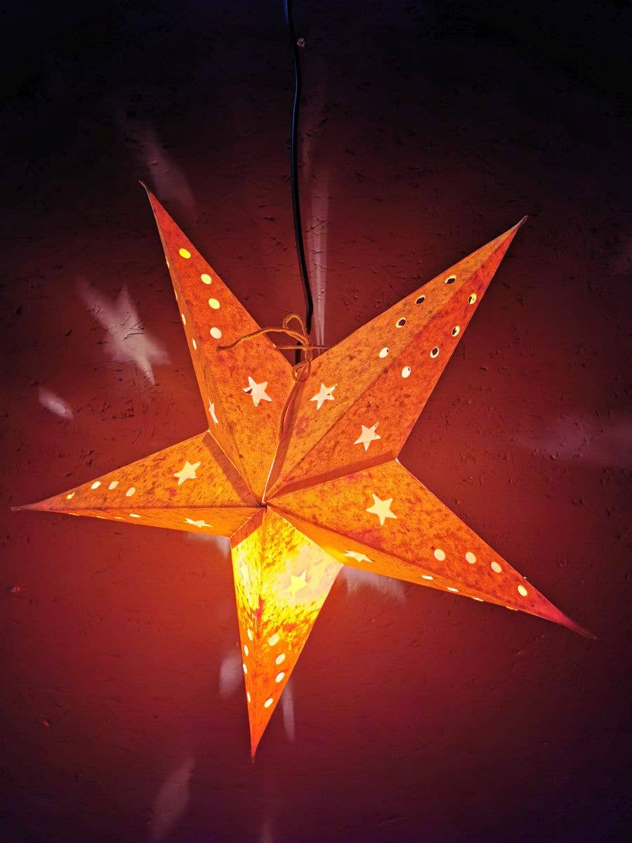Dessa söta små mini stjärnor kommer säkert att muntra upp något utrymme! Var och en är handgjord i Indien av trädfritt papper. Konstnärer återvinner bomullsstrumpor sticklingar och färgar, dekorerar och skär ”papperet” för hand. Detta är ett rättvisemärkt hantverk som ger en rättvis lön i en säker och värdig arbetsmiljö. 5 spetsig stjärna mäter 8 inches.