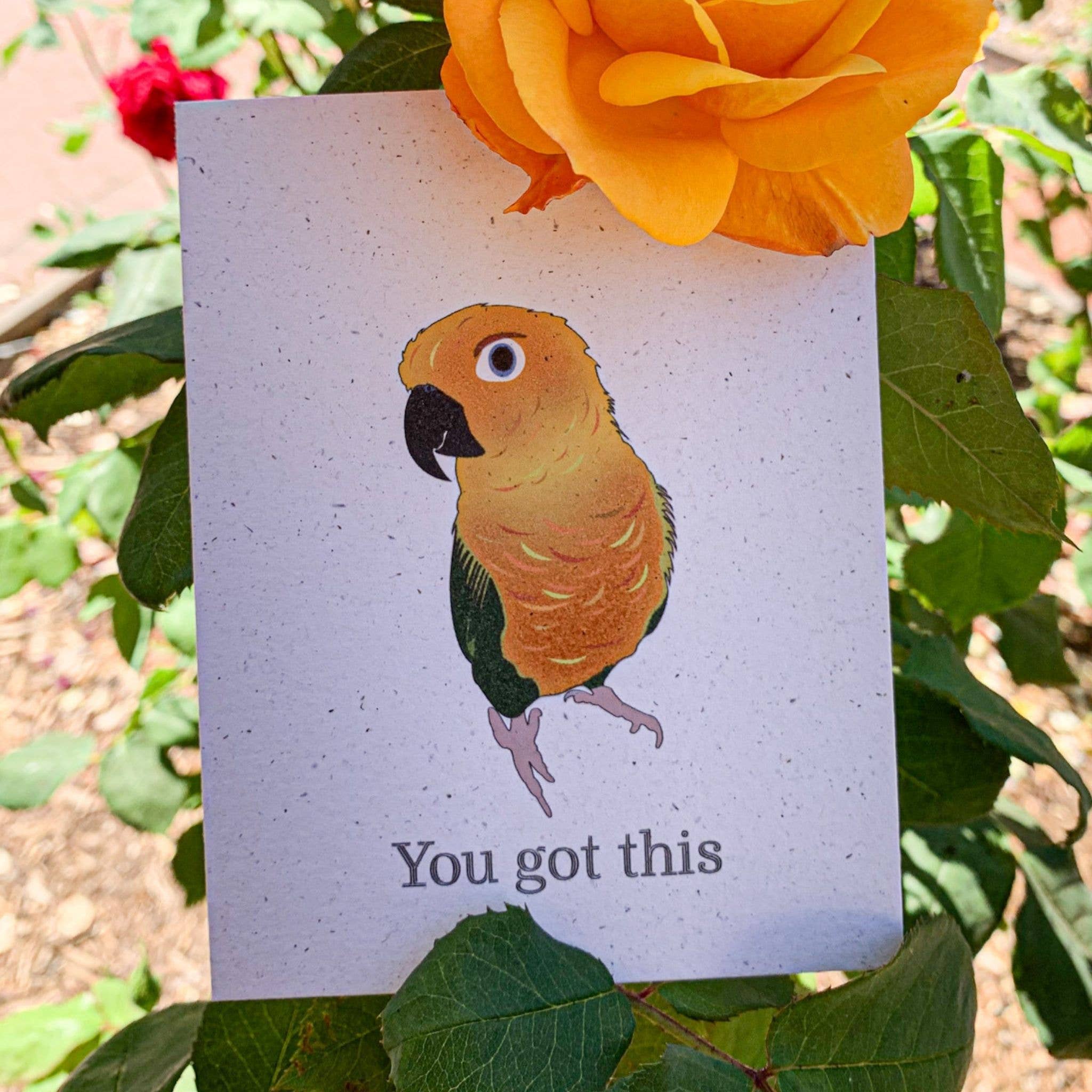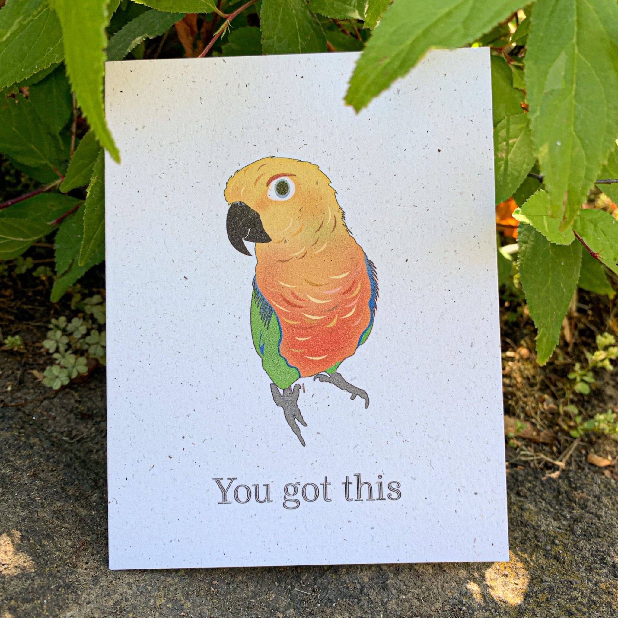 Överraska en älskad med denna fluffiga gula parakit här för att säga: ”Du har det här.” Om det någonsin fanns en tid någon behöver höra det här, så är det definitivt nu. Glöm inte. Du kan skapa en helt personlig och tankeväckande upplevelse genom att anpassa texten antingen på kortets framsida, lägga till text på insidan eller båda. Vem mottagaren än är, kommer de säkert att komma ihåg dig och i vilken utsträckning du bryr dig om att bevara världen omkring dig. Varje Hakuna Matata Vibes hälsningskort är noggrant genomtänkt genom ett miljömedvetet objektiv och folkhälsoperspektiv.