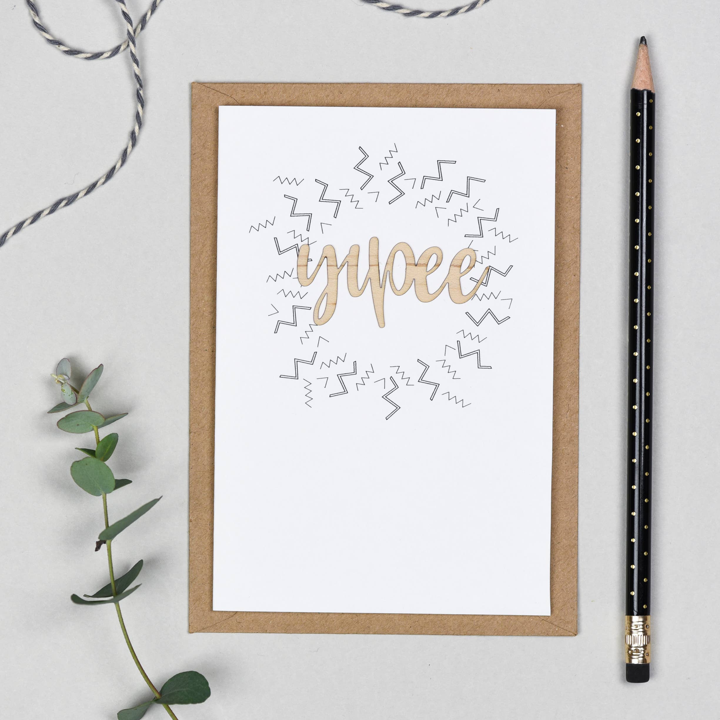 Texten är tryckt på ett vitt kort av 300gsm och avslutad med en 0,8 mm tjock laserskuren form av björkträ. Varje kort levereras med ett kraftkuvert och är utan plastförpackning. Kortens mått är 10,5 cm x 14,8 cm och de är blanka inuti. Finns i förpackningar om 3.