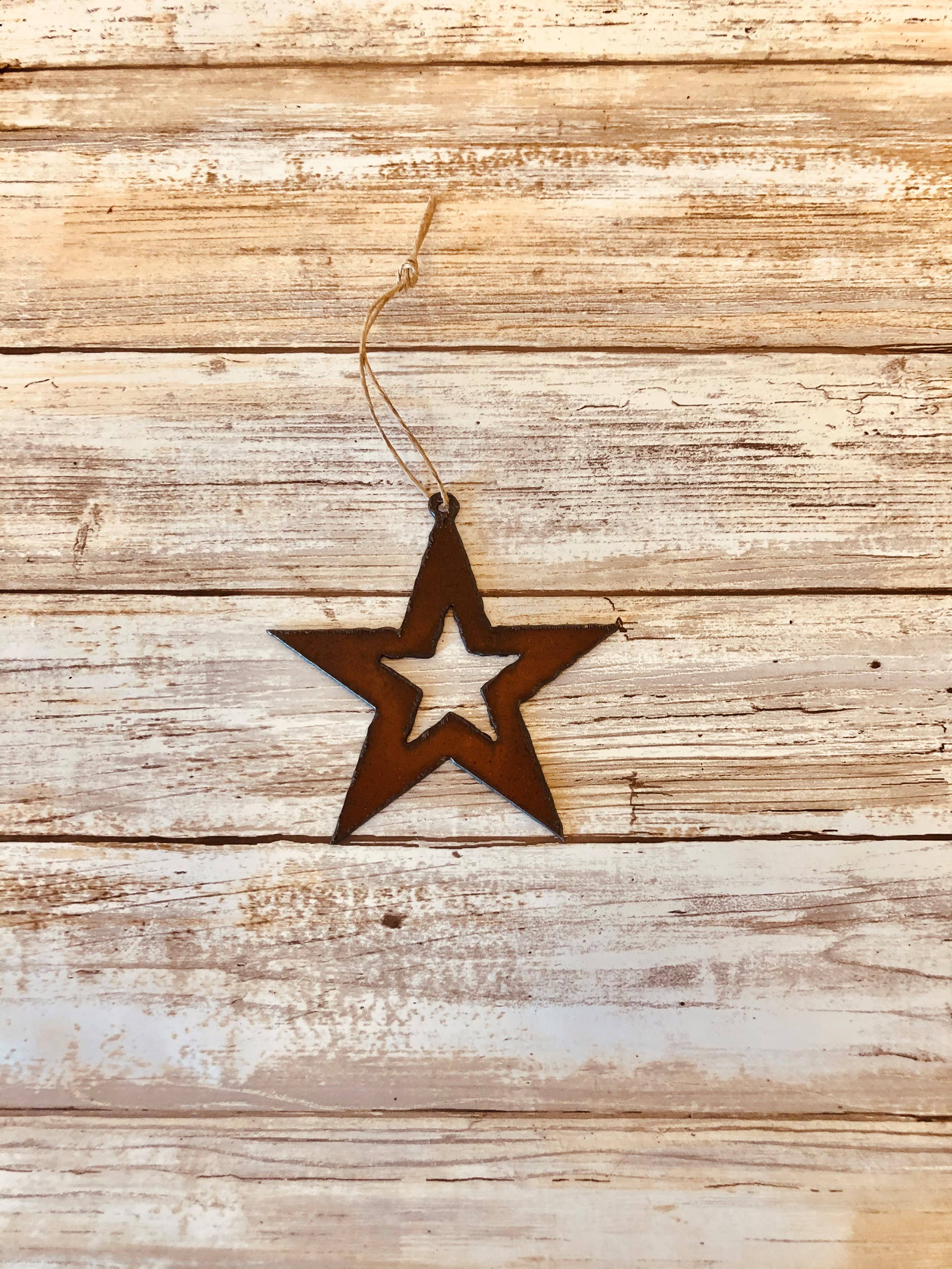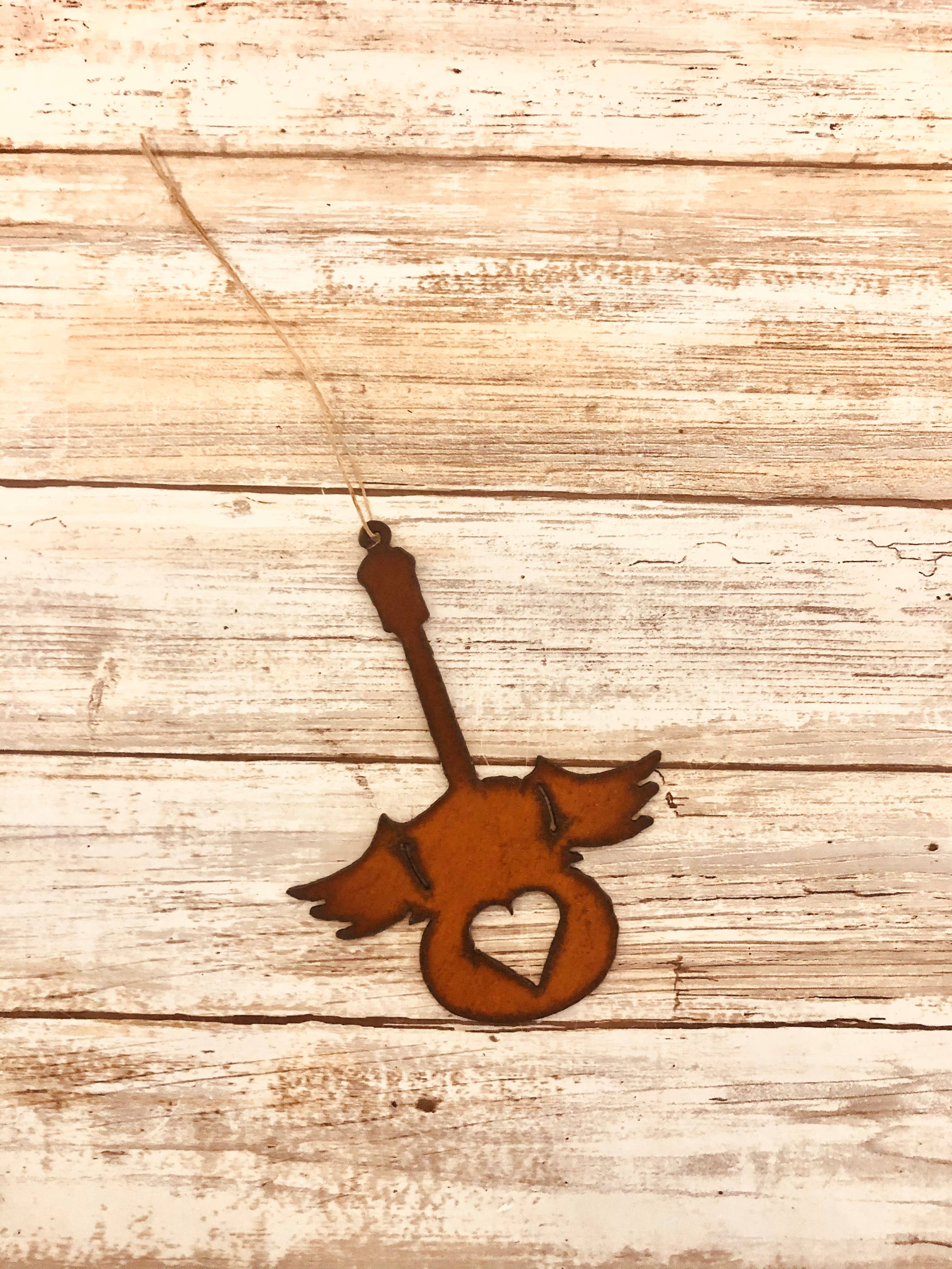 Bevingad gitarr med stjärnprydnad. 5,25 x 4 W Denna prydnad är gjord med 18 Gauge Steel. Gör att Natural Rosting Process färg kan variera något, Made In Prescott Arizona