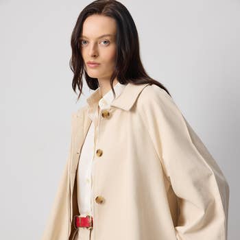 Denna trenchcoat i ren bomull är tillverkad av ett 100 % bomullstyg i enfärgat utförande. En tidlös modell med randigt foder som tillför stil och elegans. Designad med en klassisk kvinnlig kavajkrage och en enkelknäppt rad, vilket ger plagget en sofistikerad och mångsidig känsla. Trenchcoaten har dessutom en vindklaff baktill för funktionalitet och komfort. Materialet består av 100 % bomull med foder i 100 % polyester. Modellen bär storlek S, motsvarande UK storlek 8–10. Produktkod: COBCC6003.