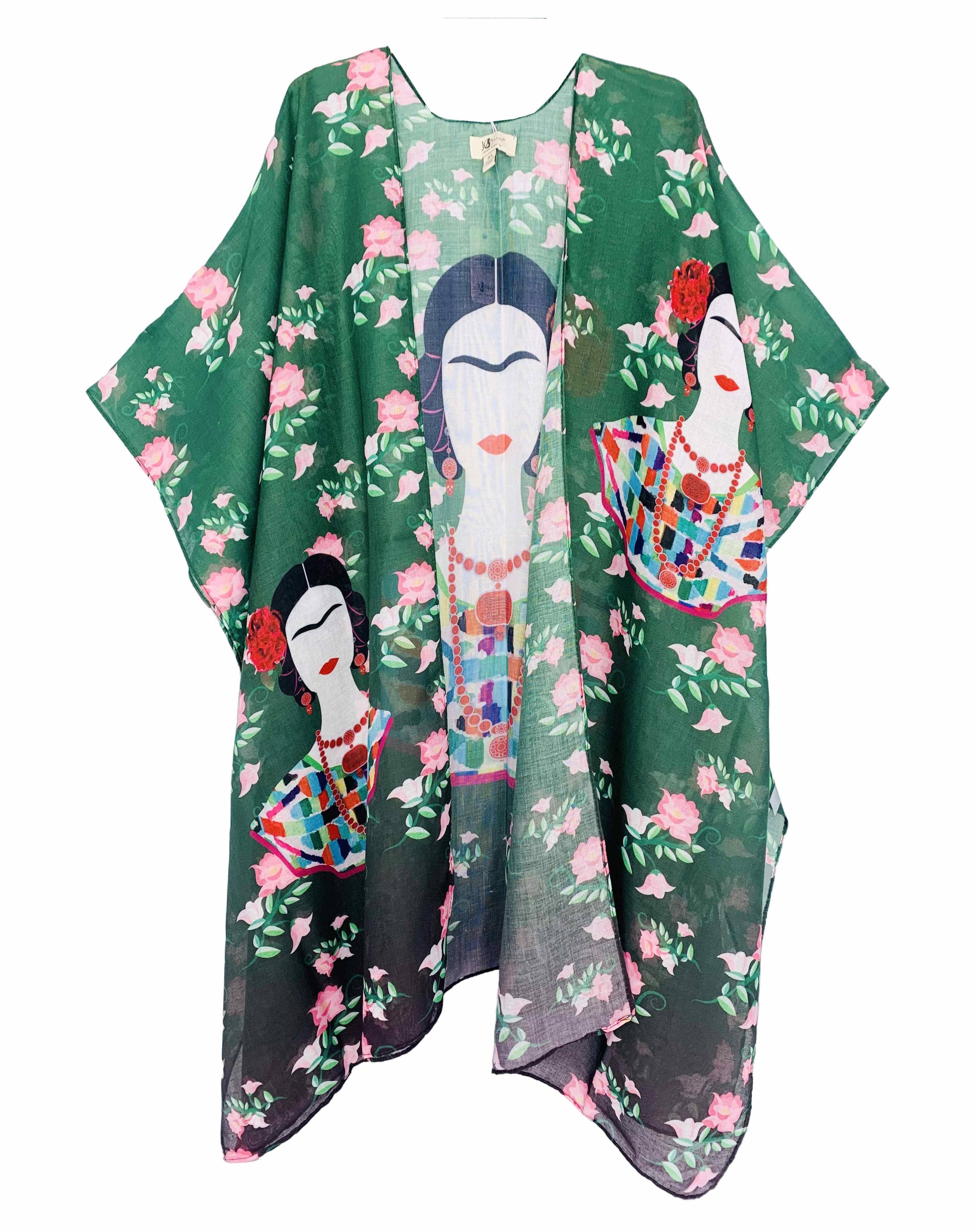 En färgglad Frida-inspirerad boho-kimono full av ikonisk stil, kultur och frihetsälskande charm — perfekt för soliga resor. Passar storlek 2-22 100% polyester Handtvätt; torka plant