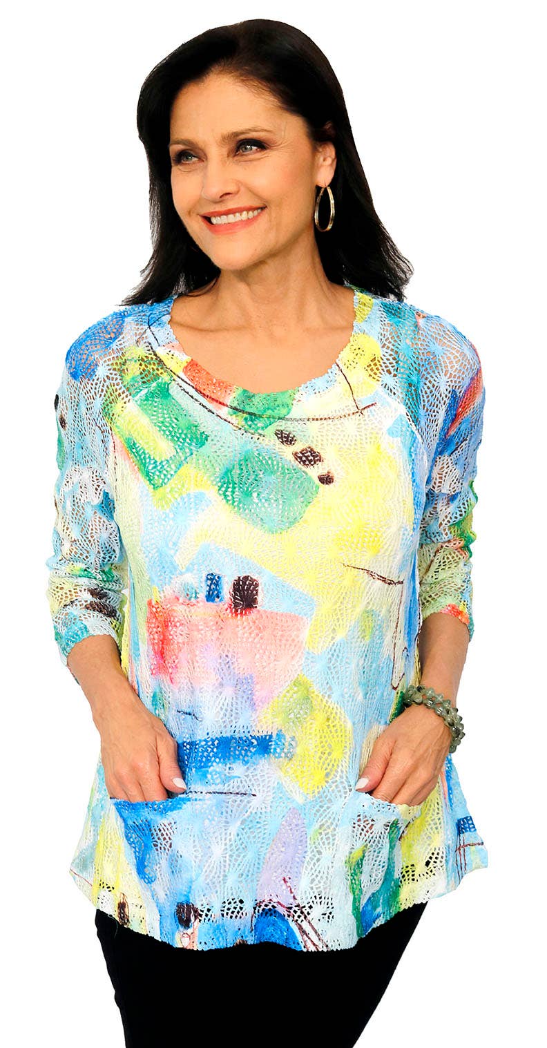 Denna Impulse California damtopp i färgglatt abstrakt mönster är tillverkad av lätta stickade tyger och prydd med en unik konstnärlig design som enkelt kan kläs upp eller ner. Den har 3/4-ärmar med flik och knapp, mandarinkrage med V-ringning. Prydd med en unik konstdesign kallad Colorful Abstract som har ett abstrakt mönster av olika färger och former. Tillverkad i USA.