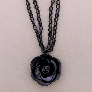 Halsband med handmålad hängande del i naturligt trä, utsmyckad med små detaljer i koppar med guldfärg. Chokerlängd 46 cm. Hängdelens mått 2 x 2 cm, längd 5,5 cm.