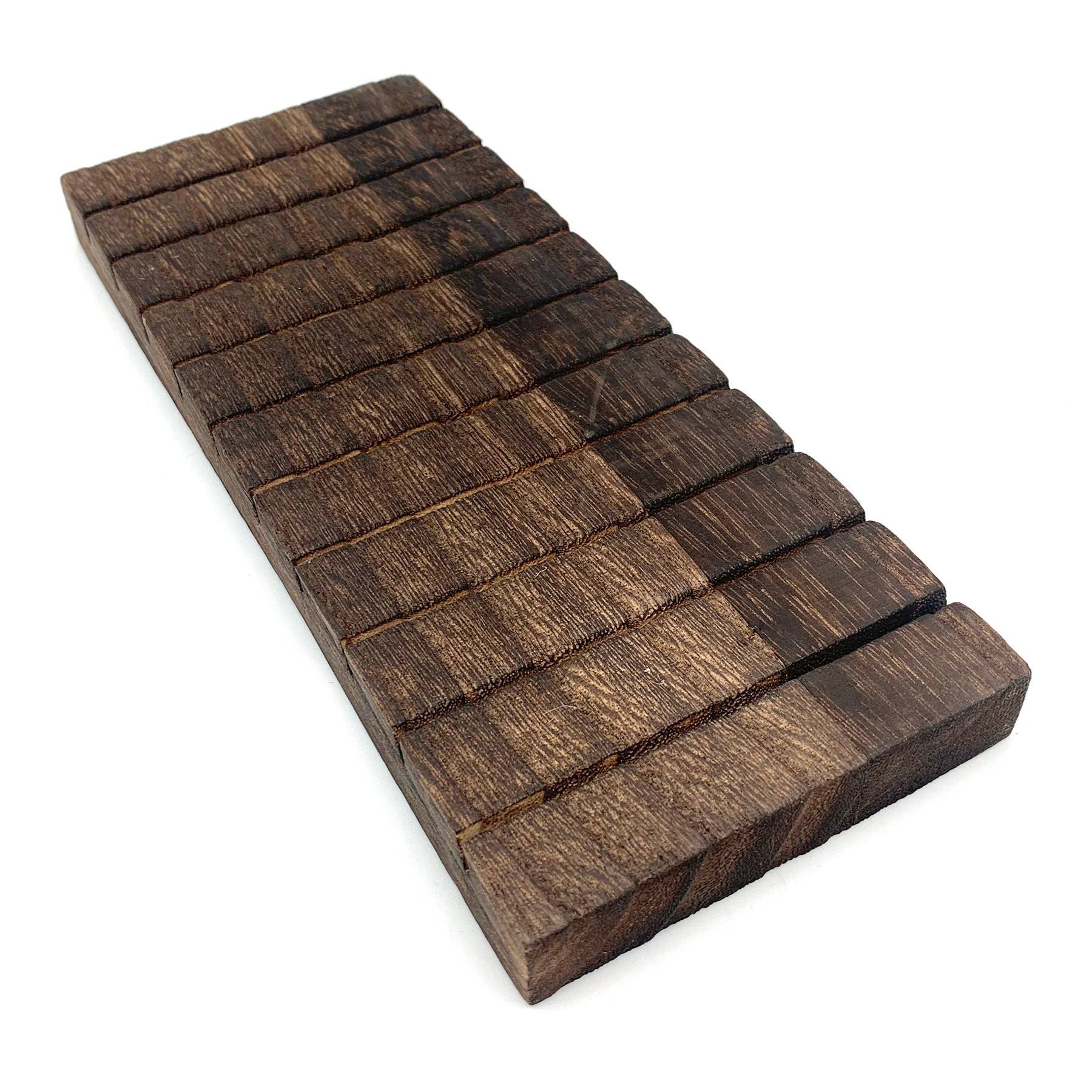 Denna solida trädisplay har 12 fack designade för att hålla örhänge- eller halsbandskort. Dess enkla, låga design ger en stabil bas och ett rent utseende för dina smycken. De parallella facken gör att du kan skapa en tät, organiserad presentation av dina kortade föremål, vilket gör det enkelt för kunder att se olika stilar. Tillverkad av massivt trä med en mörk finish, är detta hållbara block en mångsidig och minimalistisk inredning för vilken butik, galleri eller marknadsstånd som helst. Specifikationer Material: Massivt trä Finish: Mörk träbets Layout: 12 fack för att hålla kort Kapacitet: Rymmer 12 smyckeskort Totala mått: 10" L x 4" B x 1" H Avsedd användning: För örhänge- eller halsbandskort Observera: Smycken som visas på bilderna är för visningsändamål och ingår inte.