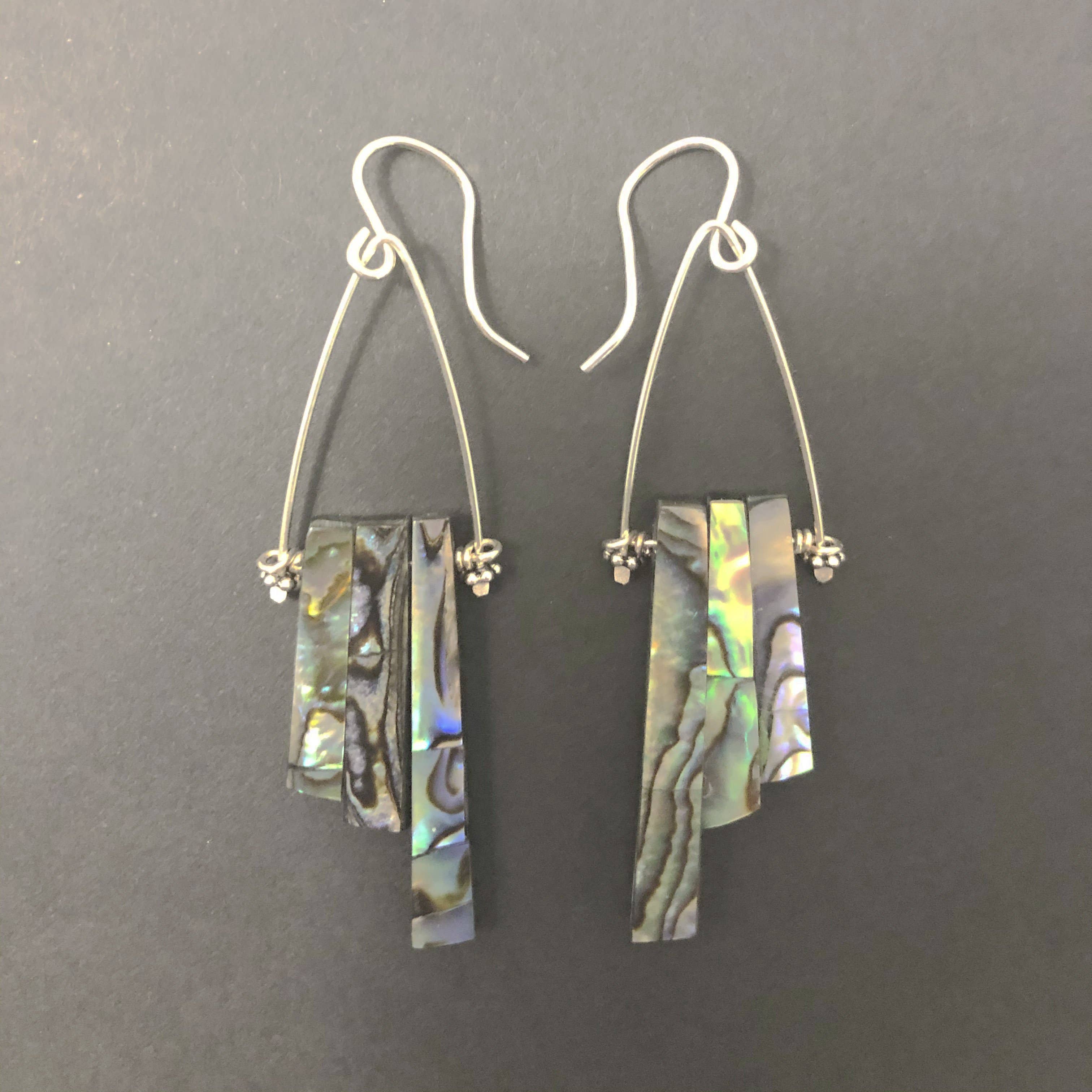 Örhängen, hamrat sterlingsilver, återvunnet svart läder, handsydda silverglaspärlor, ca 2,5 tum långa.