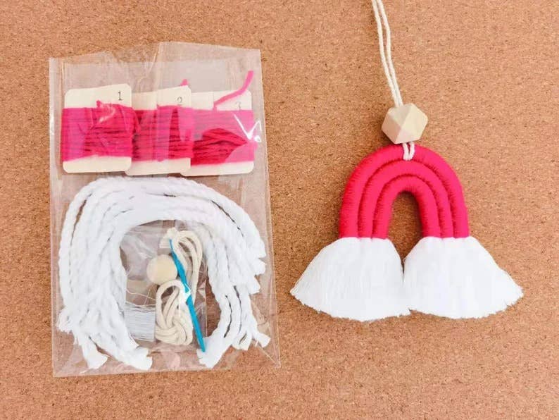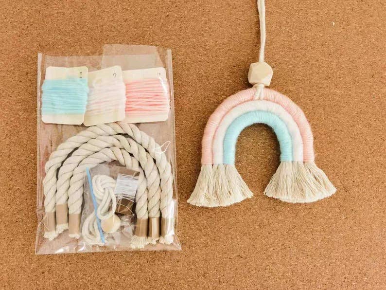 Weavey Studio | Boho makramé regnbågsnyckelring DIY-kit, nybörjarvänligt Är barnen hemma under skollov, uttråkade och gör dig tokig? Då har du kommit rätt! Du kan göra de flesta av mina makramékreationer själv hemma. Detta DIY-kit innehåller allt du behöver (makramérep, garn, nyckelring, metallnål och trådar). Det krävs inte mycket material och det är superkul att göra! Alla mönster är nybörjarvänliga och lätta att följa. Vi ger dig även en QR-kod som du kan skanna för att komma till vår handledningsvideo på YouTube. Steg för steg, enkelt för nybörjare. Detta kit är ett prisvärt sätt att prova makramé!