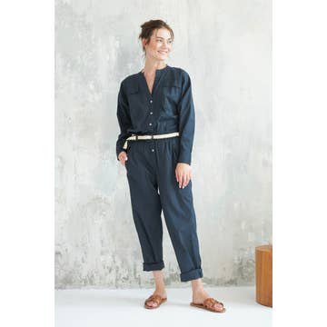 Avslappnad bekväm overall med vida ben, hängsle och sidofickor.