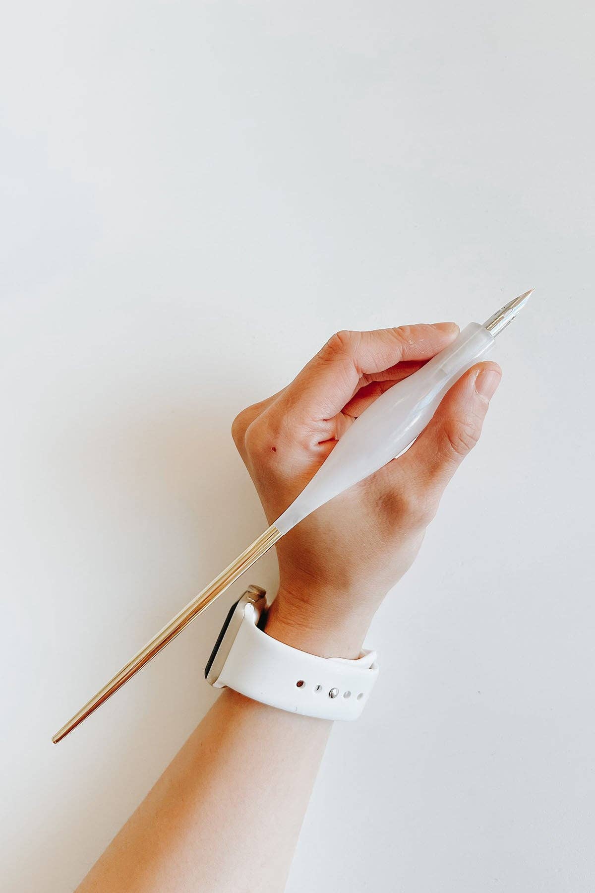 Detta är en sned kalligrafi pennhållare som är speciellt utformad för att hålla spetsiga nibs. Den är anpassad för att hålla Nikko G, som är en av mina personliga favoriter, men den kan också passa många andra liknande spetsiga pennstift. Hartskroppen är utformad för att vara upp till 0,75 tum i tjocklek, för ett bekvämt och ergonomiskt grepp. Mässingsflänsen kan justeras för att passa andra nibs och är färdig med en mässing svans. Finns i White Quartz, Rosenkvarts och Black Quartz. Som modern kalligrafer har jag alltid trott att var och en av oss har en unik kalligrafi ”röst” som vi kan dela med världen. När jag designade den här pennan försökte jag reflektera denna vision genom en minimal färgpalett, samtidigt som jag skapade en form som skulle uppmuntra bra grepp, vara bekväm att skriva med över tiden och estetiskt tilltalande. Denna penna är lämplig för höger- och vänsterhänta författare.