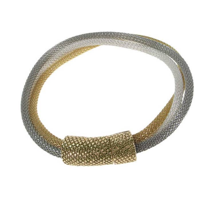 Vävt nät och texturerat magnetiskt kullås elektropläterat med antingen 18k guld, rodium eller svart nickel. Liten (passar handleder 6,5"-7") Medium (passar handleder 7"-7,5") Stor (passar handleder 8"-8,5")