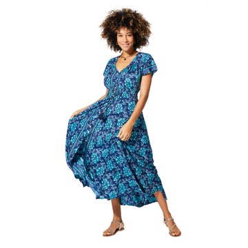 Känn dig vacker hela dagen i vår klänning med blocktryck, tillverkad av mjuk bomullsgazé. Materialet faller vackert och gör klänningen perfekt för resor, lunchdejter eller som en enkel klänning att dra över badkläderna. Material: ~ 100 % bomullsgazé. Skötselråd: Handtvätt varsamt. Lufttorka i skugga. Tillverkad i Indien. STORLEKSGUIDE Använd nedanstående mått och information för att hitta bästa passform så att du kan bära Bhavnasboutique-klänningar med lätthet. Måtten anges i tum. Längd - Mini - 87 cm Midi - 125 cm Storlek S - Bröstvidd 40" Storlek M - Bröstvidd 42" Storlek L - Bröstvidd 44" Storlek XL - Bröstvidd 46" OBS: Detta är plaggets mått och inte kroppens mått. Vid frågor om storlekar, kontakta gärna vårt team. På grund av handtillverkningen av varje modell kan det förekomma små avvikelser. Varje plagg är unikt och begränsat i antal.