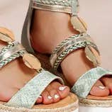 • Färg: Finns i flera trendiga nyanser. • Stil: Glamourös och modern. • Design: Ovandel dekorerad med glänsande strass och en dekorativ rem för en chic look. • Sula: Tjock platå som ger komfort och stabilitet. • Foder: Invändigt vadderat för optimal komfort. • Material: Blandning av textil och konstläder med högkvalitativa detaljer. • Användning: Perfekta för speciella tillfällen eller för att ge vardagsoutfiten en extra glamorös touch. Dessa mules kombinerar elegans och komfort för en unik och djärv stil.