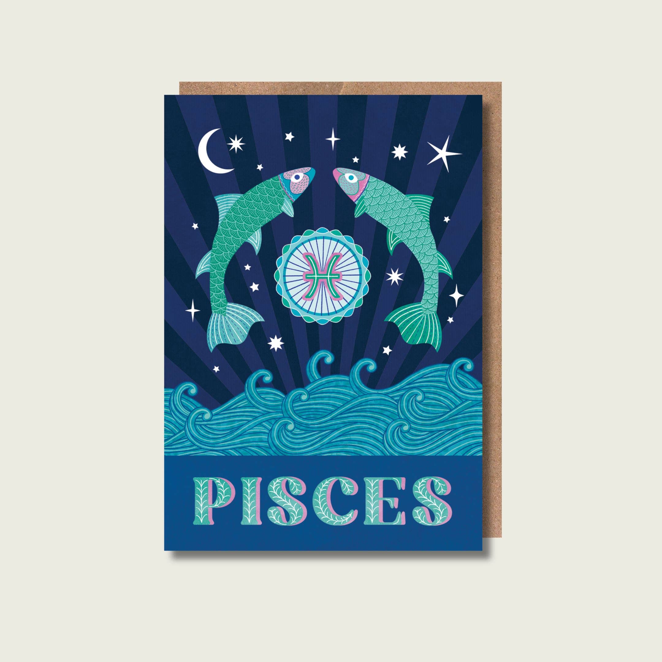 Fiskarnas stjärnteckenkort. Illustration av två fiskar som hoppar upp ur havet. Ett av 12 vackert illustrerade Zodiakkort. För födelsemånaderna februari och mars. A6-storlek. Tillverkad i Storbritannien och tryckt med miljövänliga färger på tjockt, lätt texturerat FSC-certifierat kort, som är fullt återvinningsbart. Levereras med ett brunt kraftkuvert i en växtbaserad biologiskt nedbrytbar cellopåse, med ett spårband eller utan. Vänligen ange din preferens när du beställer. Zodiak, Fiskarna gratulationskort, zodiak födelsedagskort, stjärnteckenkort, horoskop, astrologi, himlakroppar, stjärnor, psykedelisk konst, astrologisk konst, typografi, fiskar, hoppande fiskar, vatten, vågor, hav, måne