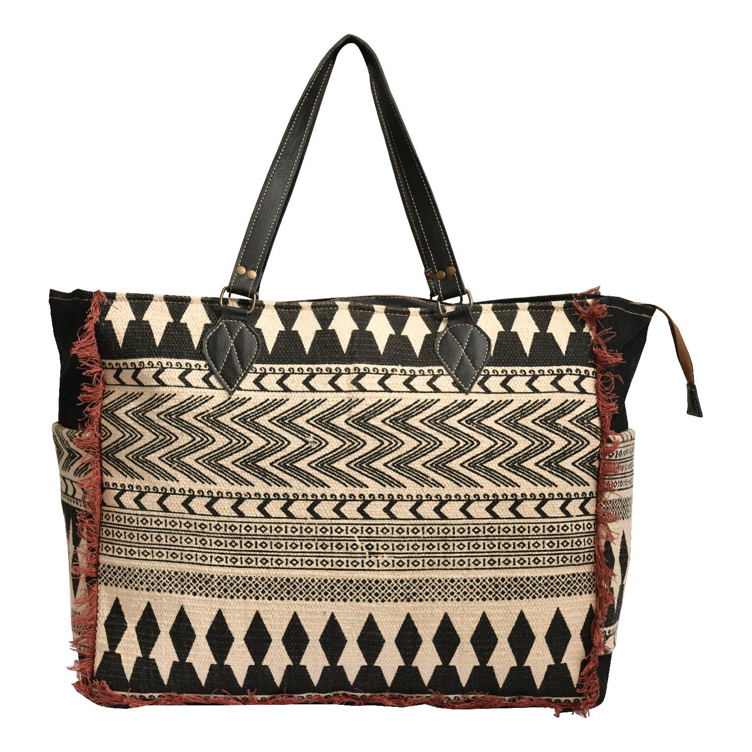 Denna väska har en stor volym och är idealisk för weekendresor. Tillverkad av bomullstyg, hairon, läder & canvas. Huvudfacket har blixtlåsförslutning med innerfickor, tillsammans med en fram- och bakficka för någon som bär sin värld av väsentligheter med sig.