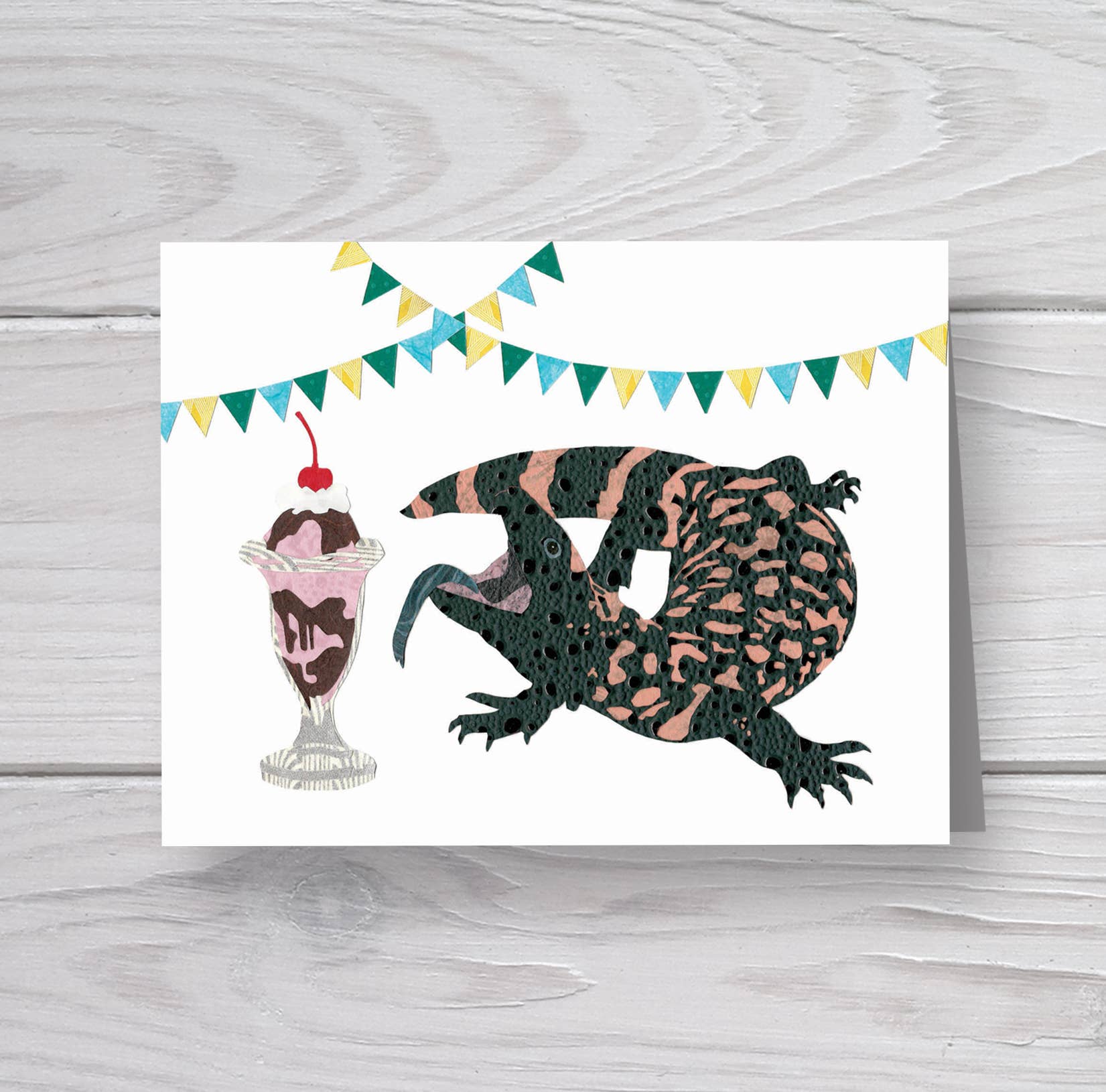 Denna tryffelgris jagar sitt eget kök! Kuvert: Matchande Vit med baronial klaff Mått på A2 gratulationskort: 5,5" x 4,25” Inuti: Blank Tryckt på: 120# Vit Accent Ogenomskinlig (slät yta perfekt för att skriva!) Skyddad i klar cellofanhylsa Detta är en tryckt reproduktion av originalkonstverket. Original collage konstverk av Alexa S. Brooks