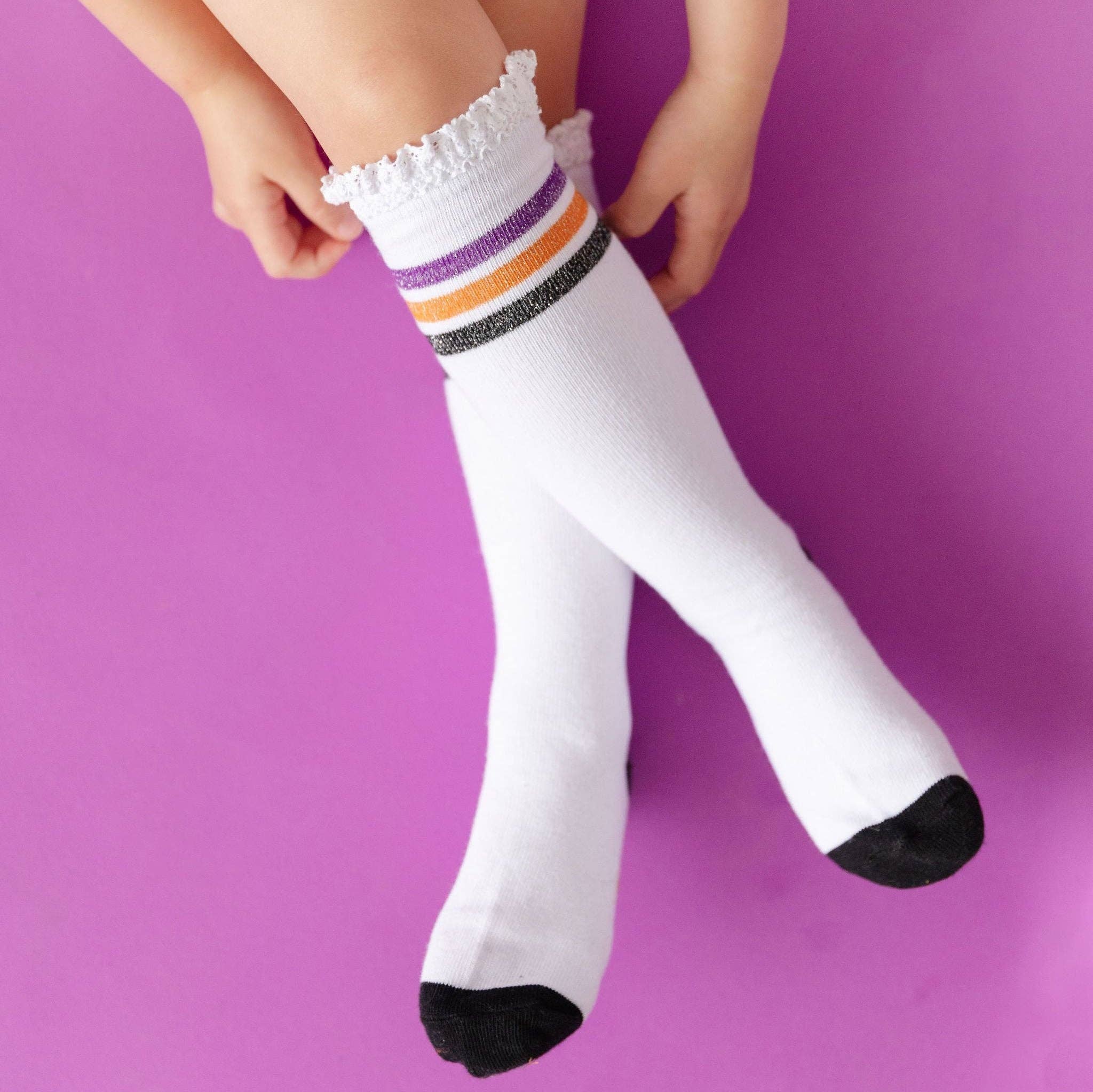 Vertikalt Randiga Knälånga Strumpor i Spets - Svart/Vit Maskintvättas kallt med liknande färger. Torktumla på låg värme eller låt ligga plant för att torka. 79% bomull / 19% polyester / 2% spandex Importerat.