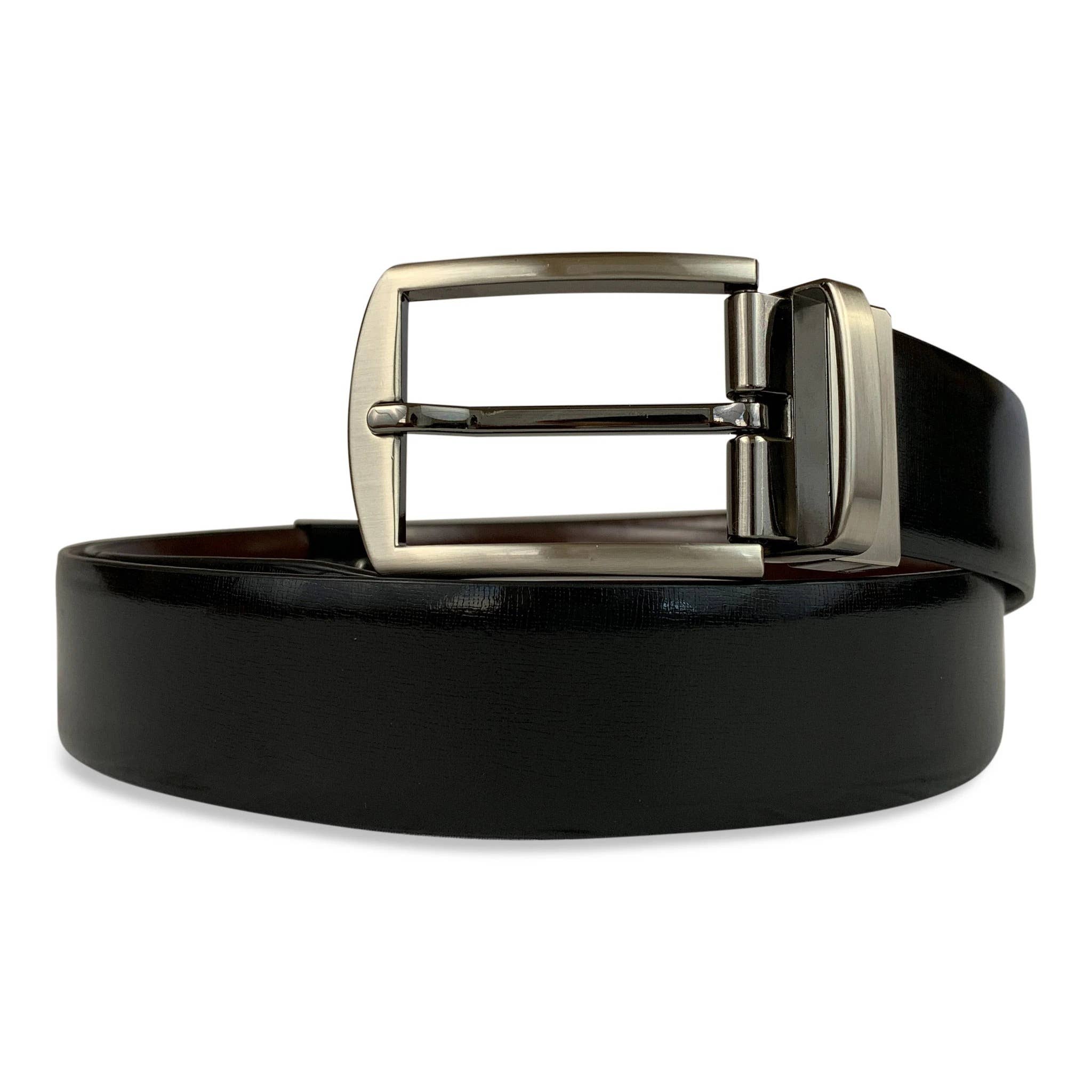 Ett viktigt för mannen med trovärdighet och övertygelse att bryta sig igenom dödlägen och få jobbet gjort. Handgjord. Vändbar med djupa jetsvarta och kungliga hickorybruna sidor. Silverfärgad enstift spänne. Par med affärs- eller avslappnad klädsel. Varje bälte har 5 hål med 2,5 cm/1 tum mellan 2 hål. Lägg 5 cm/2 tum till ett lägre nummer för spännet till mitthålet. Tillverkad i förstklassigt italienskt läder.