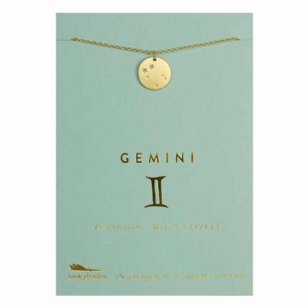 GEMINI TVILLINGAR, passionerad, dynamisk och smart gör dem expertkommunikatörer. Gemini representerar zodiakens kameleont, skicklig på att blanda in i olika sociala grupper, baserat på vibe och energi. Delikat och elegant, detta halsband kompletterar jeans, affärskläder och din lilla svarta cocktailklänning. MER OM KOLLEKTIONEN De nickelfria zodiakens halsband har ett justerbart 16-18" kabelhalsband med en fritt flytande skivcharm som visar din skylts konstellation. Halsbandet är 14k guld doppad och försedd med kristall accent stenar som stjärnor.