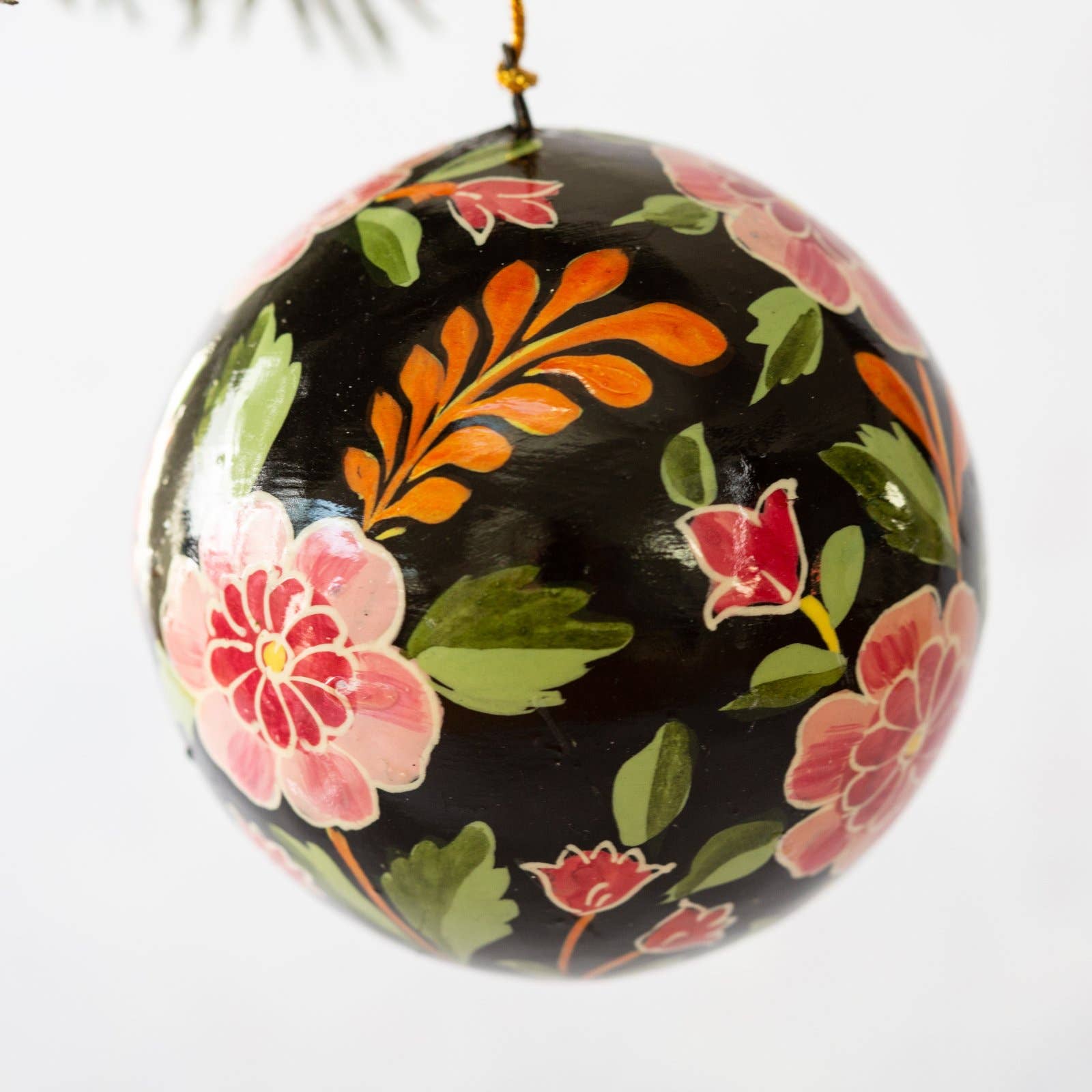 Handmålad julgranskula med en diameter på cirka 5 cm. Tillverkad av papier-maché. Vacker och färgglad julgransdekoration som kan hängas året runt.