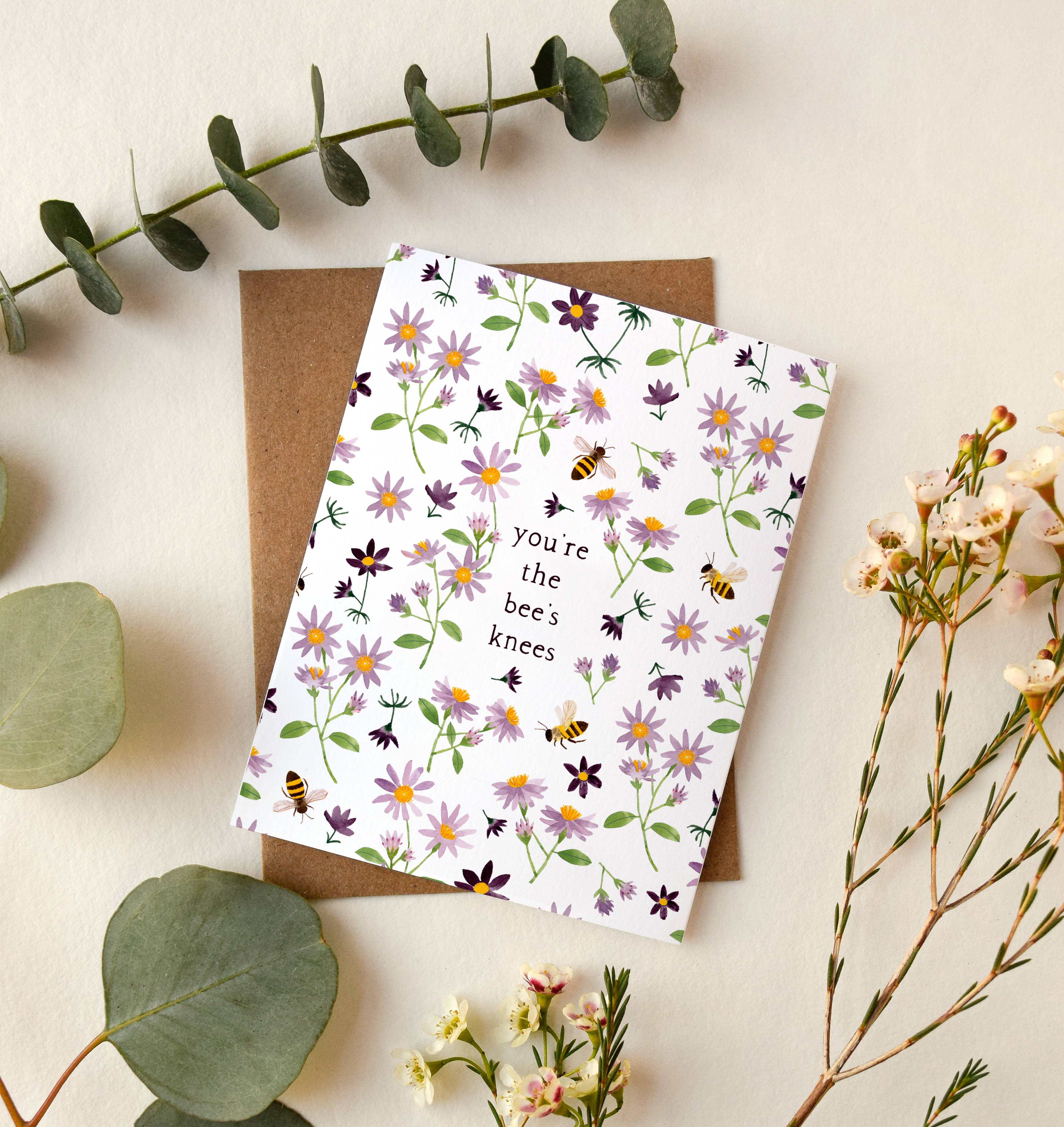 En ljus bukett, nyplockad i den svala höstluften. Specifikationer: + A2 tomt vikta kort med kraftkuvert* + Akvarell illustration av Leana Fischer + Vackert tryckt på tungt äggskalskort Hur det är gjort: + Mina gratulationskort skrivs ut av ett familjeägt företag i Alabama. + Enstaka korthylsor är gjorda med PLA (erhållen från växter)