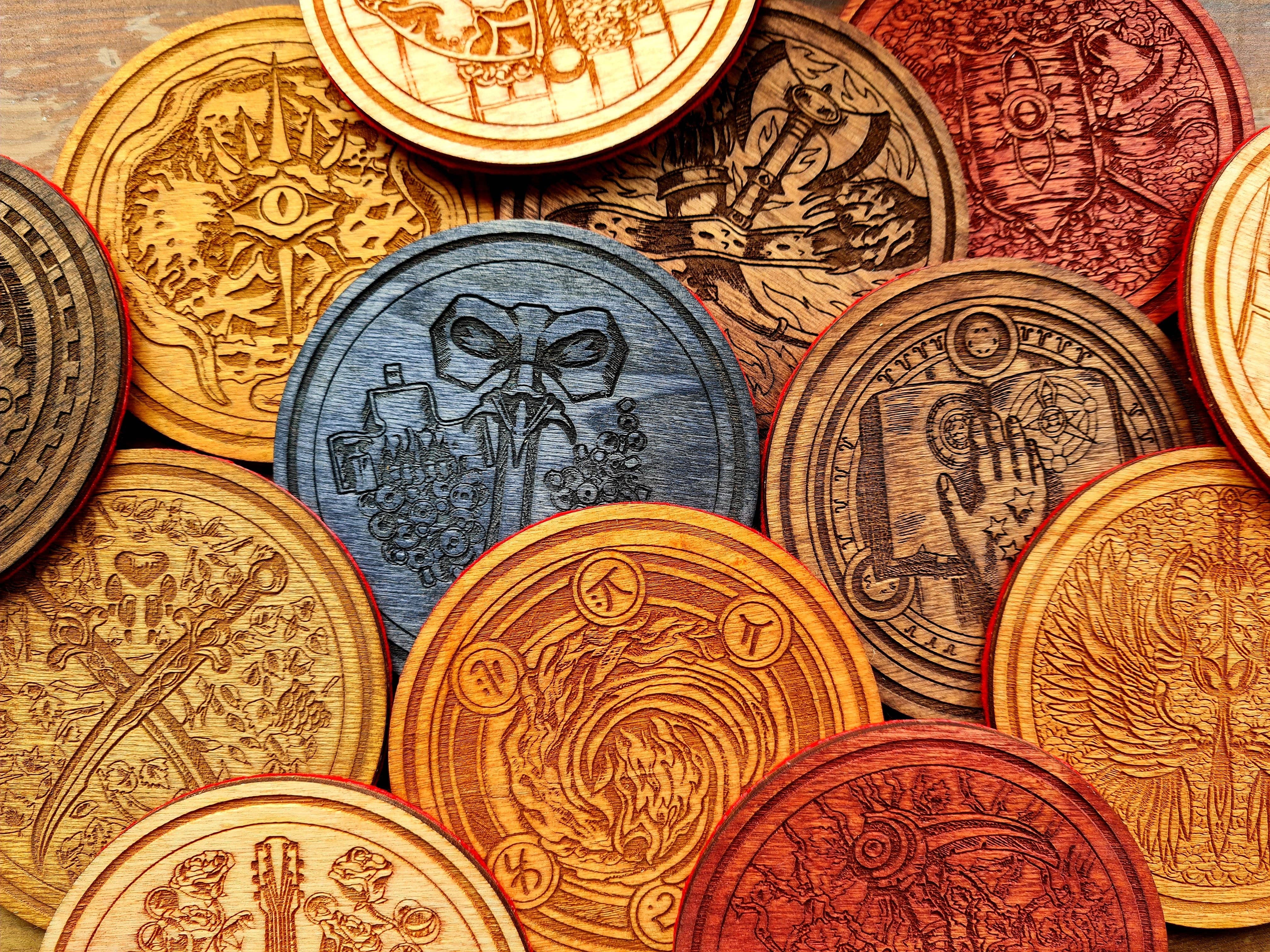 Set med 7 RPG-tärningar med tematiska symboler och färger Tillverkad av critit.co.uk Endast