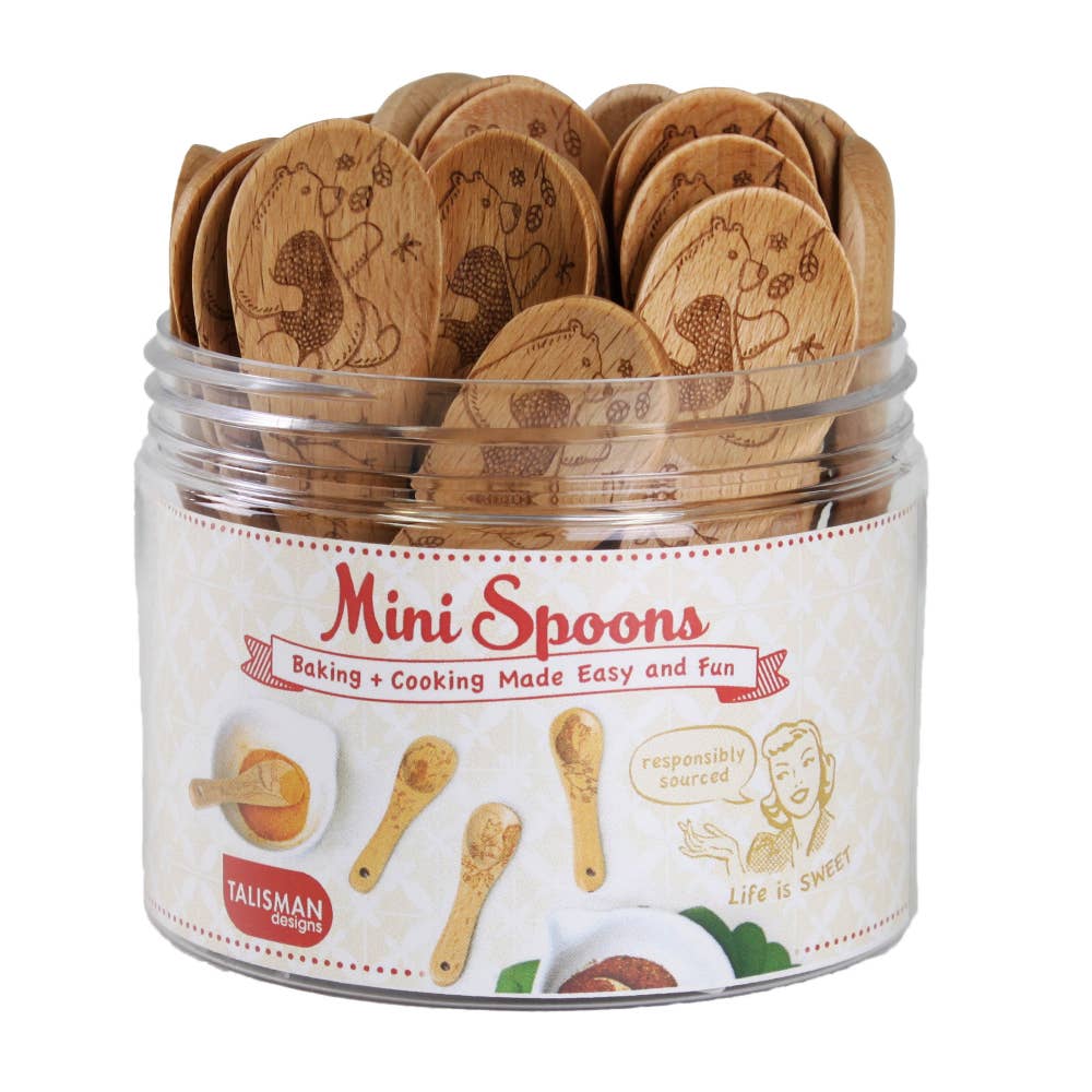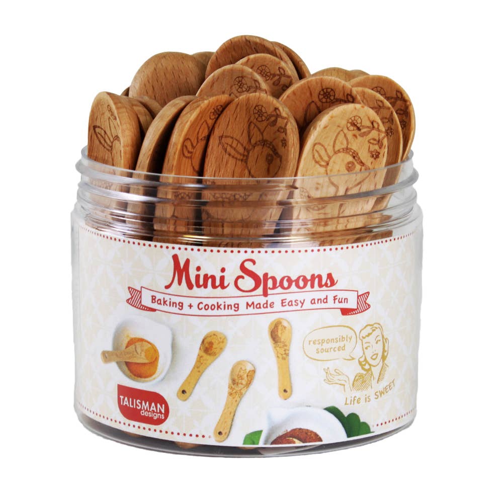 Mini-skeden är perfekt för att servera sylt, senap, kryddor och för att förbättra charkuteribrädor. Tillverkade av helt naturligt bokträ, de är hållbara, långvariga och har permanent etsade mönster som inte bleknar. Den naturliga oljefinishen ger dem en mjuk känsla. För bästa vård rekommenderas handtvätt för att bibehålla deras kvalitet och livslängd. Detta set är en 24-enhetsdisplay av Mini-skedar - Uggla Skogsmotiv—de är söta, praktiska och ett bra tillskott till vilket kök som helst!
