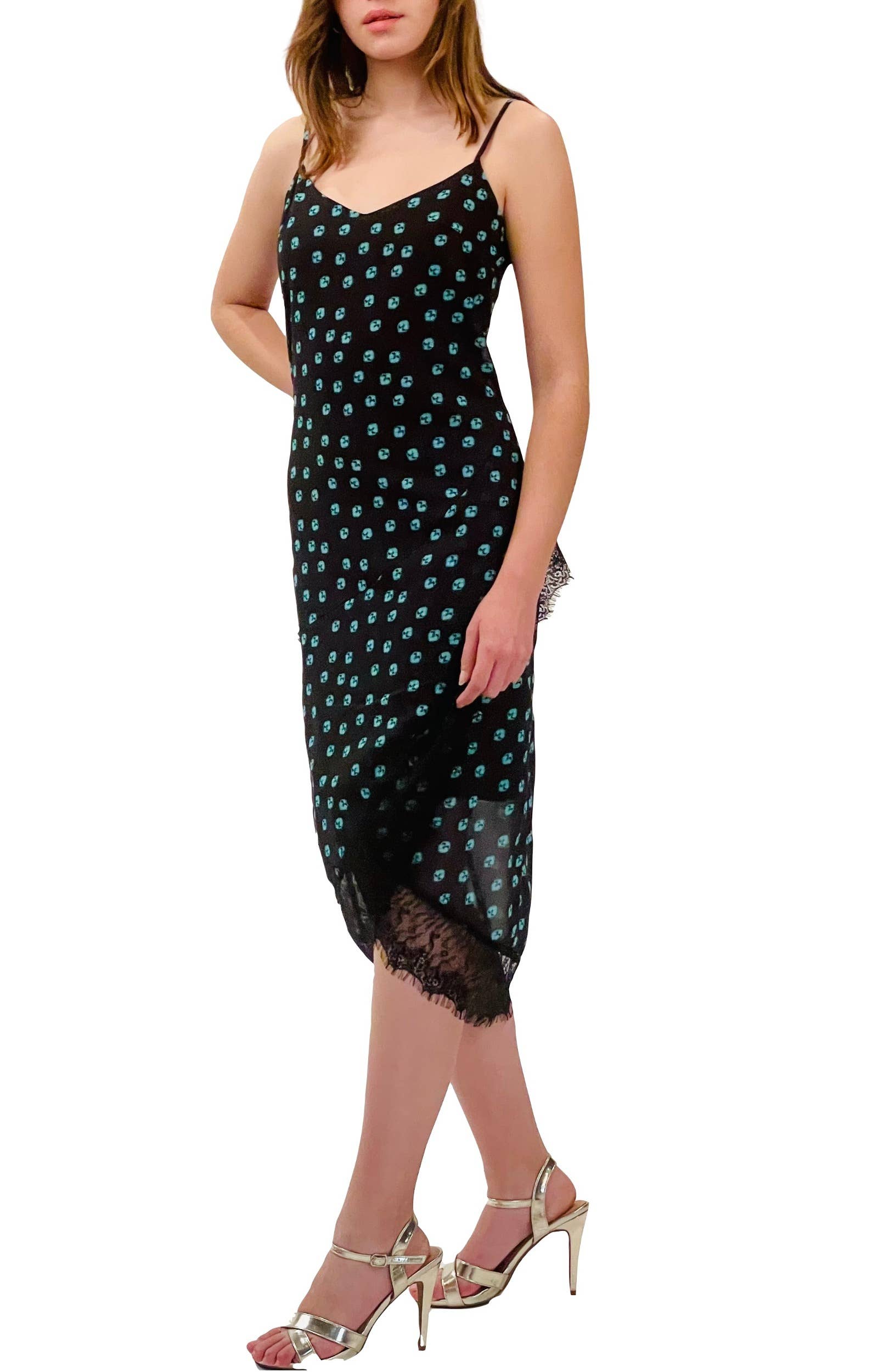 Figurnära klänning med båtkrage fram och öppen rygg. Ärmarna är korta med volangform och har en liten axelvaddering för att framhäva figuren. Tyget är mjuk crepe med 5 % elastan som ger en fin passform längs silhuetten. Klänningen är midi-lång med en elegant och sensuell öppning framtill. Den är fodrad med stickat tyg. Designad i Spanien.