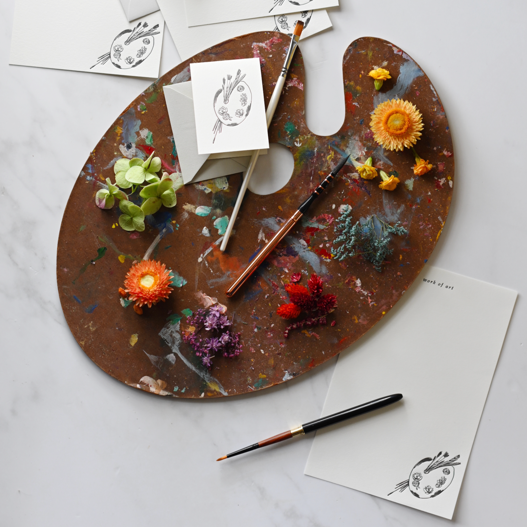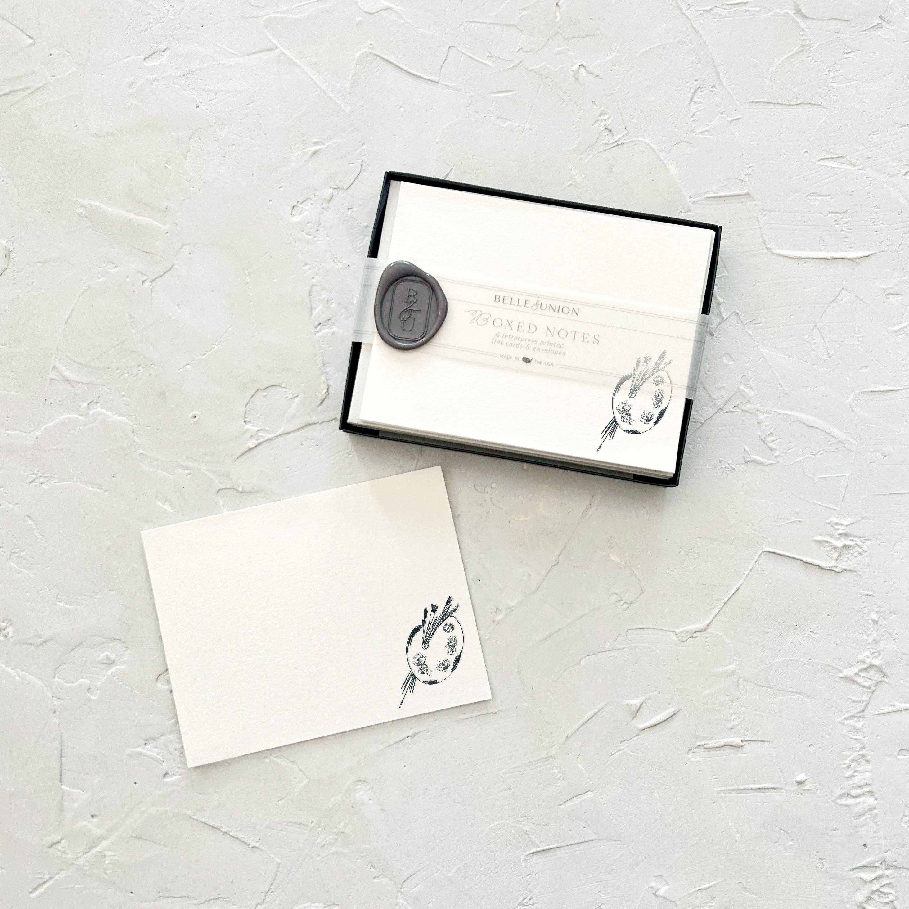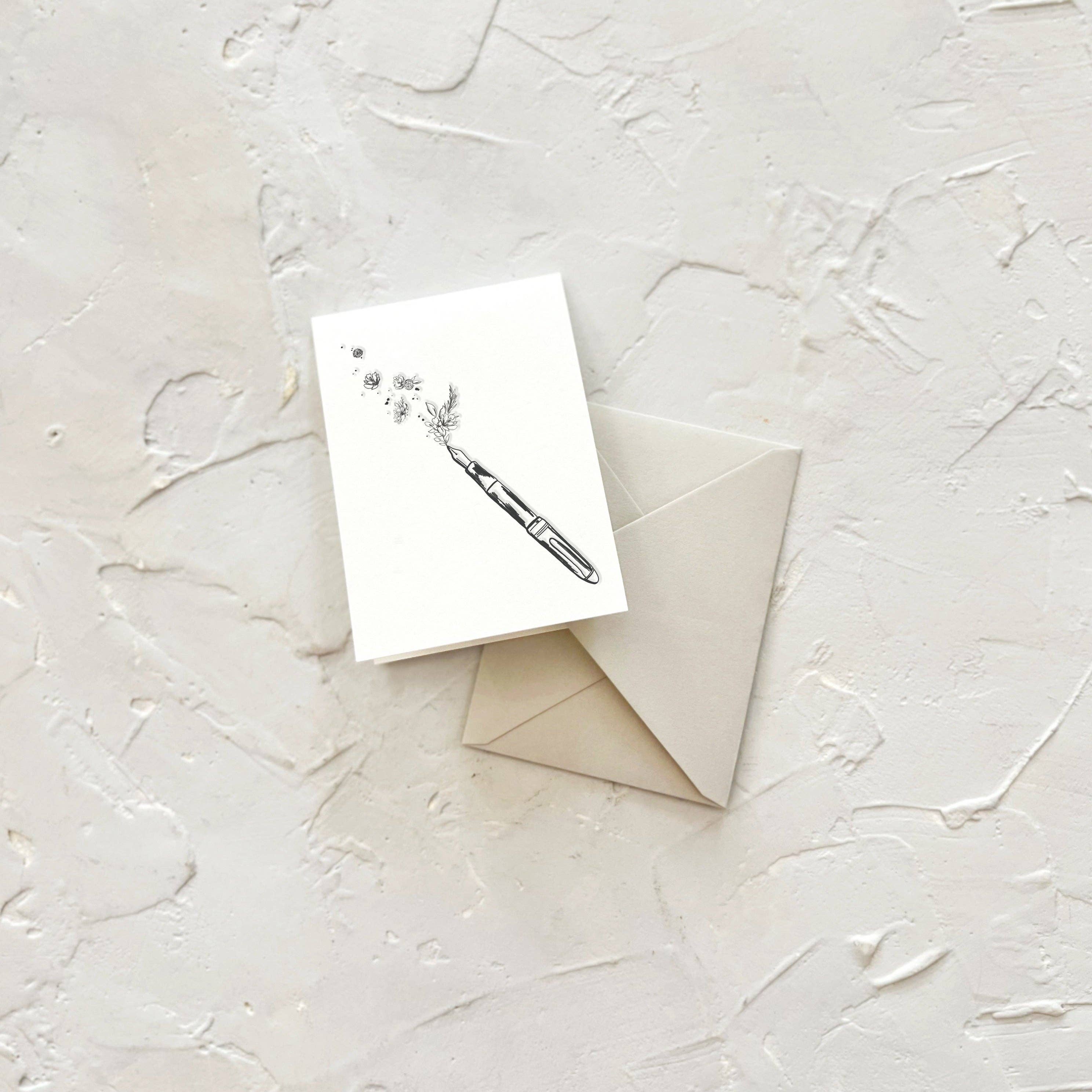 Kärlek på papper. Våra nya brevskrivningssatser tillfredsställer de som behöver mer utrymme än ett gratulationskort. Varje ark skrivs ut en sida i taget, vilket ger en touch av karaktär och värme till varje bokstav. Denna uppsättning har en illustrerad reservoarpenna med blommor, med en textrad som säger ”penna till papper”. (Koppla ihop med våra Flourish Boxed Notes, Mini Enclosure Cards eller matchande klistermärke!) * Lyxig 100% bomull, textviktspapper * 12 tryckta ark * 6 ljusgrå kuvert * Förpackad i en klar cellohylsa med ett vellum magband, med en vaxförsegling med en kvist torkade blommor för en vacker presentation * Tillverkad i USA