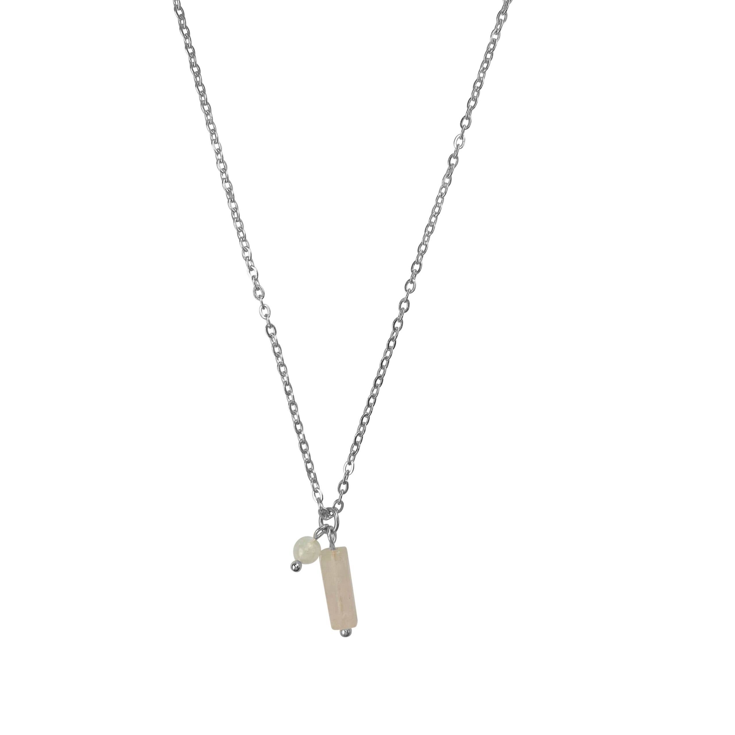 Halsband i rostfritt stål med rosenkvarts och månsten. Längd: 42 cm + extra längd
