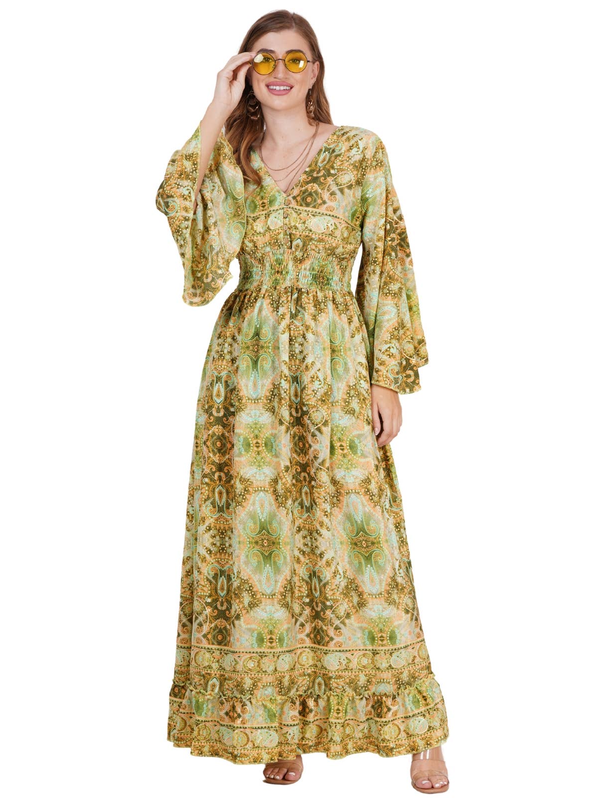 Klockärmad V-ringad avslappnad boho blommönster maxiklänning för kvinnor