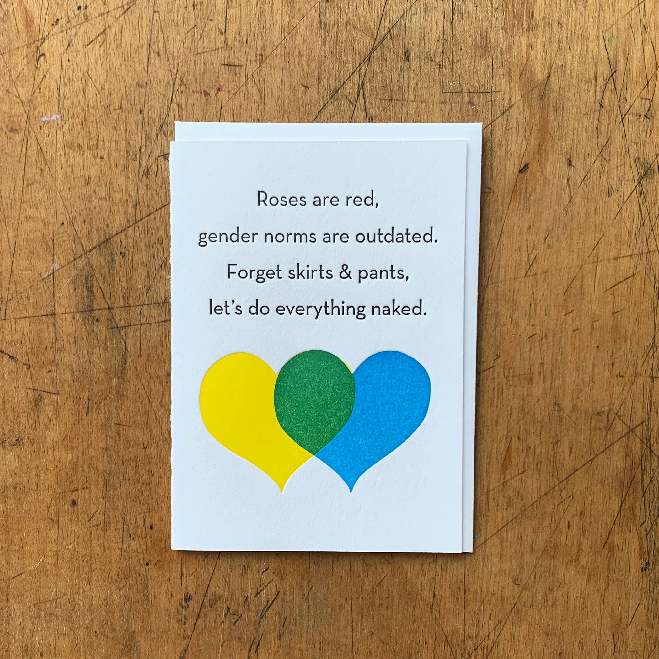 Löser att säga ”du fullbordar mig.” Svart bläck på ljust vitt 100% bomullspapper, parat med ett kraftkuvert. Ny uppdaterad A2-storlek (4,25 ”x 5,5") vikad, tom inuti. Individuellt förpackad i en klar växtbaserad komposterbar polyhylsa. Tryckt för hand på antik boktrycksutrustning i Portland, Oregon.