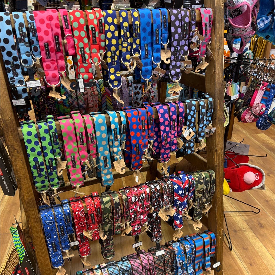 Prestanda, komfort, stil och hållbarhet! Alla ursprungliga mönster. Vatten/smutsavvisande tyg. Konturerade, snabbspännen för komfort och säkerhet. Maskintvätt. ALLTID 100% GARANTERAD (japp, även om det tuggas:) Betrodd kvalitet sedan 2002. Stilar som finns i krage, koppel, bågar: KRAGAR XS 5/8" bredd, passform 8-12" S 3/4" bredd, passform 10-14" M 1" bredd, passform 12-18" L 1" bredd, passform 14-25" XL 1,5-tums bredd, passform 16-25" KOPPEL 5' lång Tunn 5/8" bredd Regelbunden 1" bredd BÅGAR 5 x 2,5" REVERSIBLA SPORTBANDANAS STOR: Trekantig form 30" x 21" x 21 tum Medelstora hundar. Mänsklig ansiktsmask, tillbehör LITEN: Triangelformad 24" x 17" x 17" Mindre storlek hundar under 20 lbs.