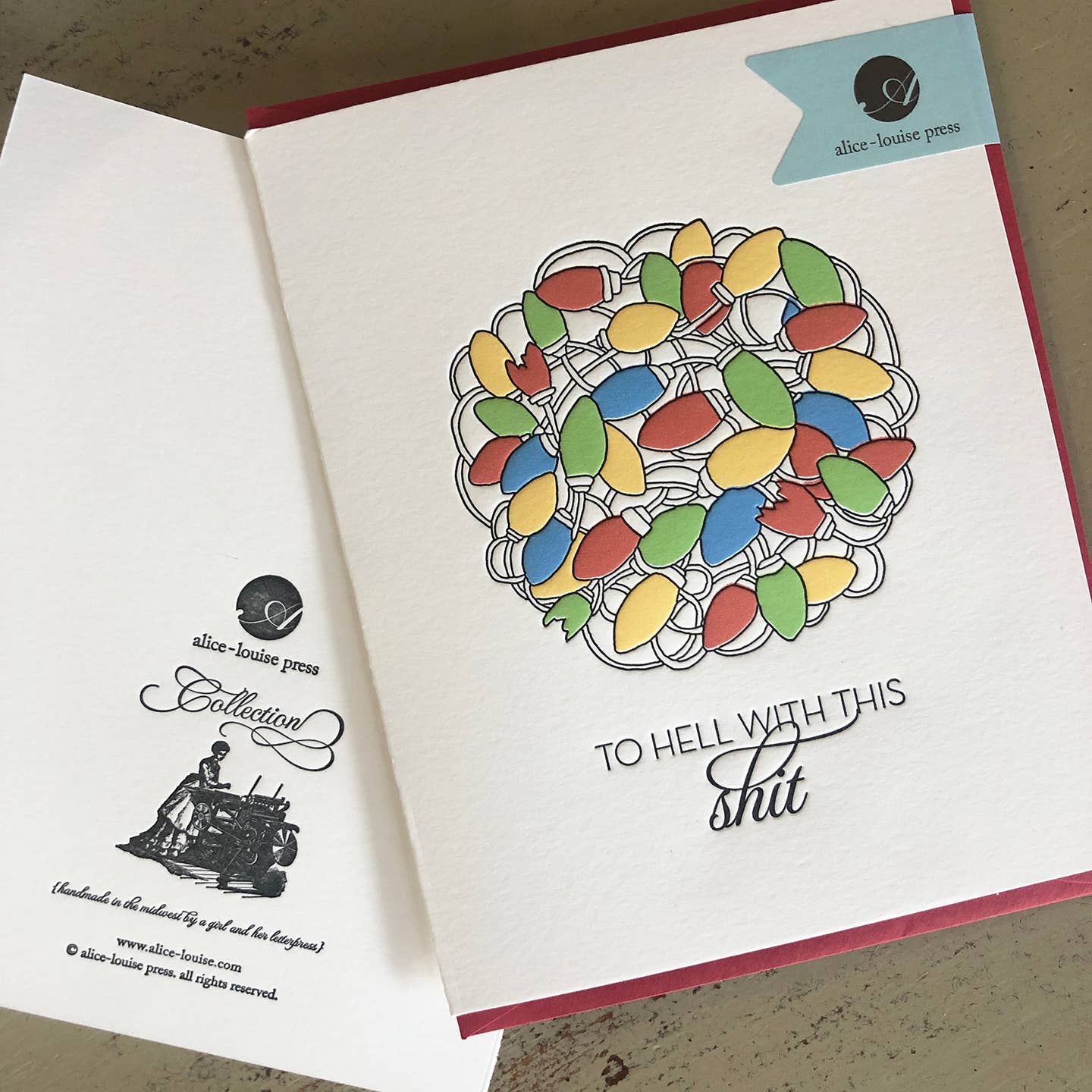Till helvetet med den här skiten Bokstäverpressat A2-vikta gratulationskort tryckt på vår antika Heidelberg Windmill på ett vackert äggskalöverdrag, tom inuti. Välj mellan ett enda kort förpackat med ett rött kuvert i en cellohylsa eller låduppsättning med 6 kort med röda kuvert förpackade i en klar låda. Tillverkad i Mellanvästern av en tjej och hennes boktryck.