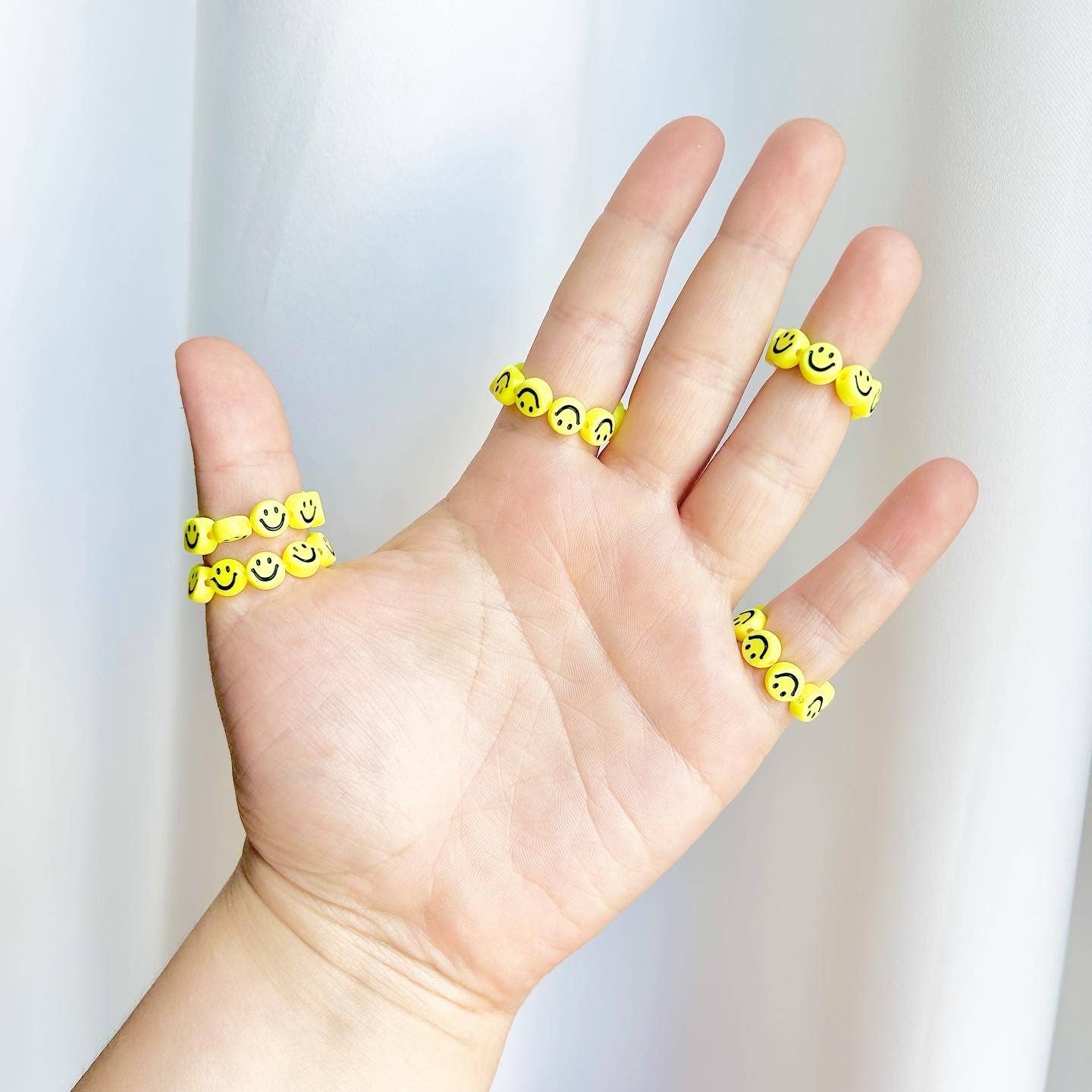 Dessa stretchiga och storleksinkluderande ringar är gjorda av glas- och plastpärlor som bildar en prästkragekedja. De är tillverkade med kristallelastisk tråd och knuten är säkrad med superlim för att säkerställa att den inte går upp. Dessa ringar är extremt hållbara! Jag har haft dem i flera år både för mig själv och kunder utan att de gått sönder. Storlekarna är ungefärliga och baserade på amerikanska storlekar: Liten: Ringstorlek 5-8 Stor: Ringstorlek 8-11 Skötsel: Dessa är inte gjorda av metall så de bör inte missfärga dina fingrar, men undvik kontakt med handdesinfektionsmedel för att säkerställa att pärlornas färger förblir desamma.