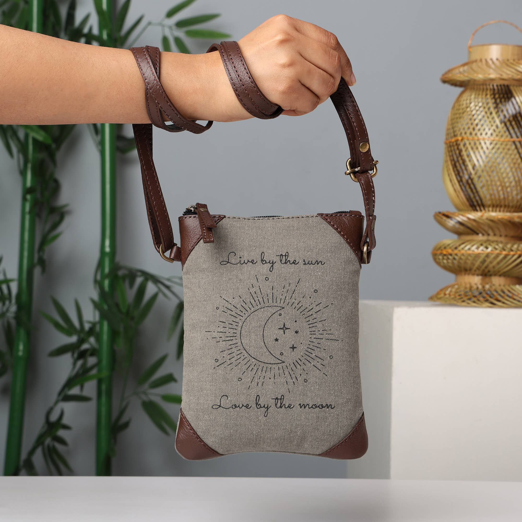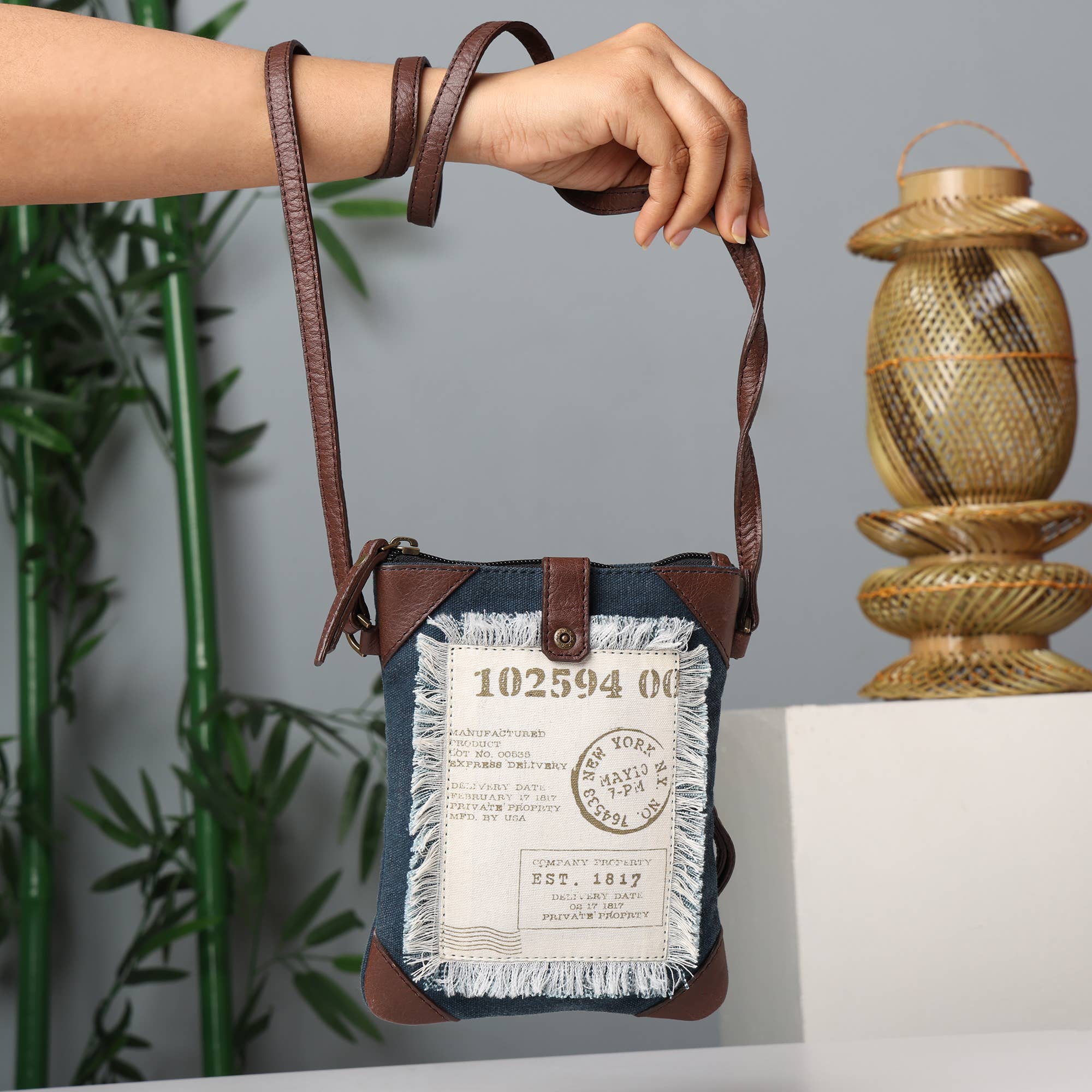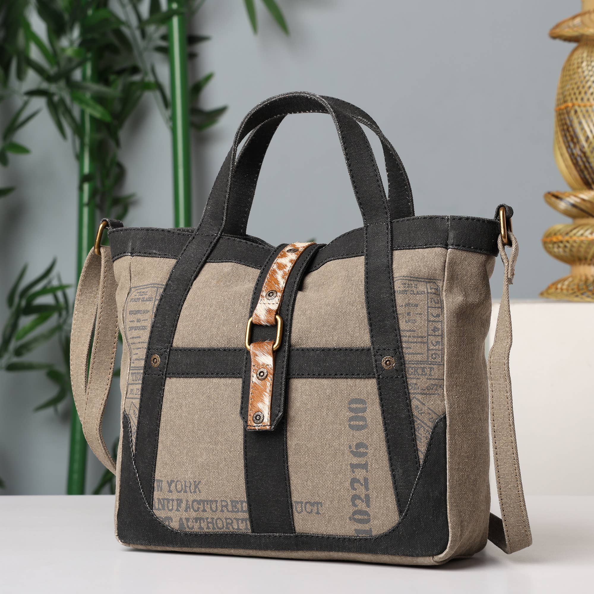 Storlek: 14 ”B x 10,5 ”H x 3" D Handtag: 9" handtagsfall och levereras också med en 15" justerbar crossbody-rem Interiörfunktion: En blixtlåsficka och en glidficka med två fack Stängning: Dragkedja - Toppstängning Material: Upcycled Canvas med original läderklädsel Kort beskrivning: Ett snyggt sätt att bära alla dagliga väsentligheter med utrymme att spara. Expertkonstruerad av uppcyklade militära presenningar och tält och vegansk läderklädsel. Tillverkad av slitstarka återfrästa och uppcyklade militära presenningar och tält som används av armén.