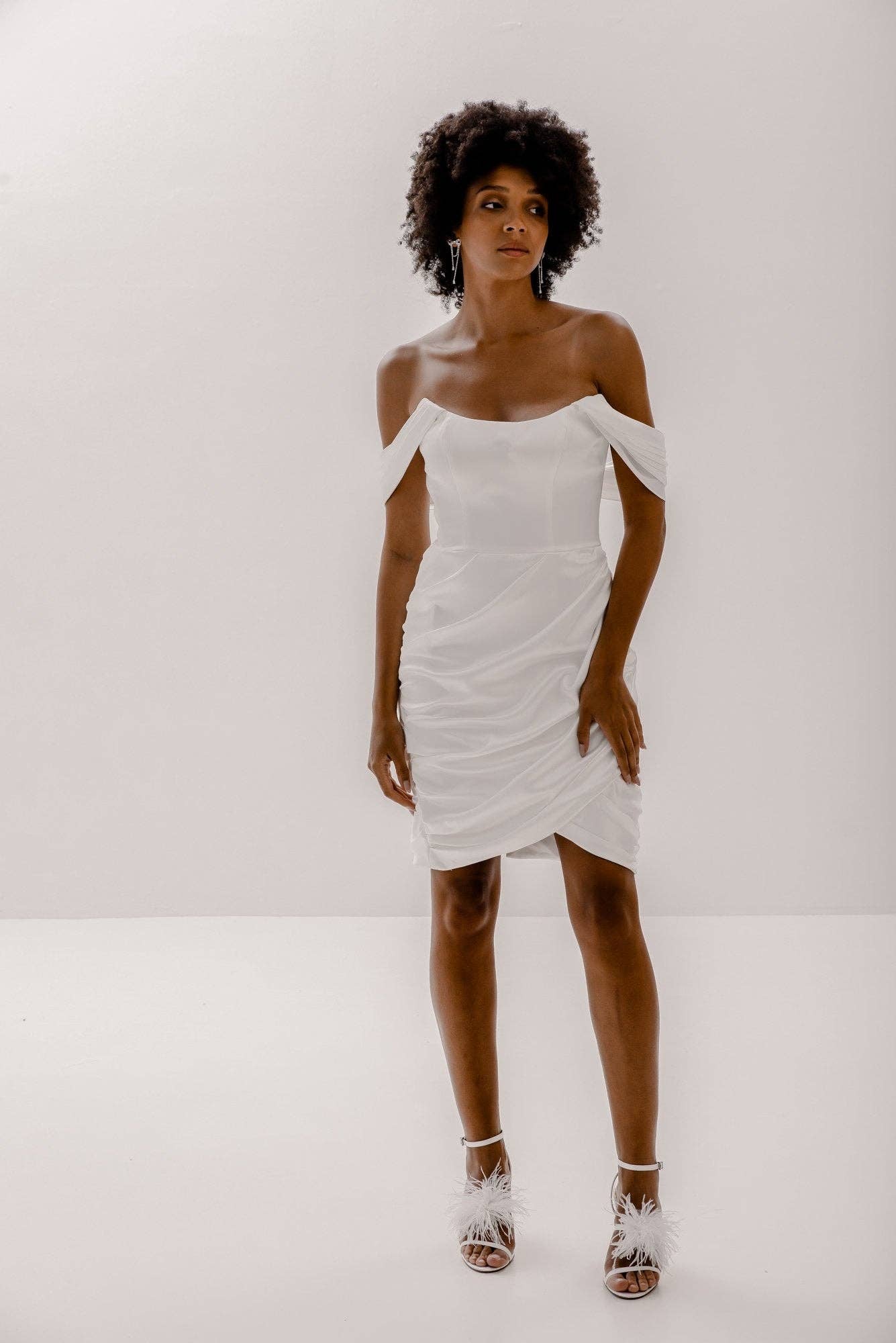 Klänningen har en djup V-ringning och en offwhite fodring. Det helt pärlade tyllöverlaget ger en elegant känsla, medan den korta, flödande kjolen skapar en smickrande och romantisk siluett.