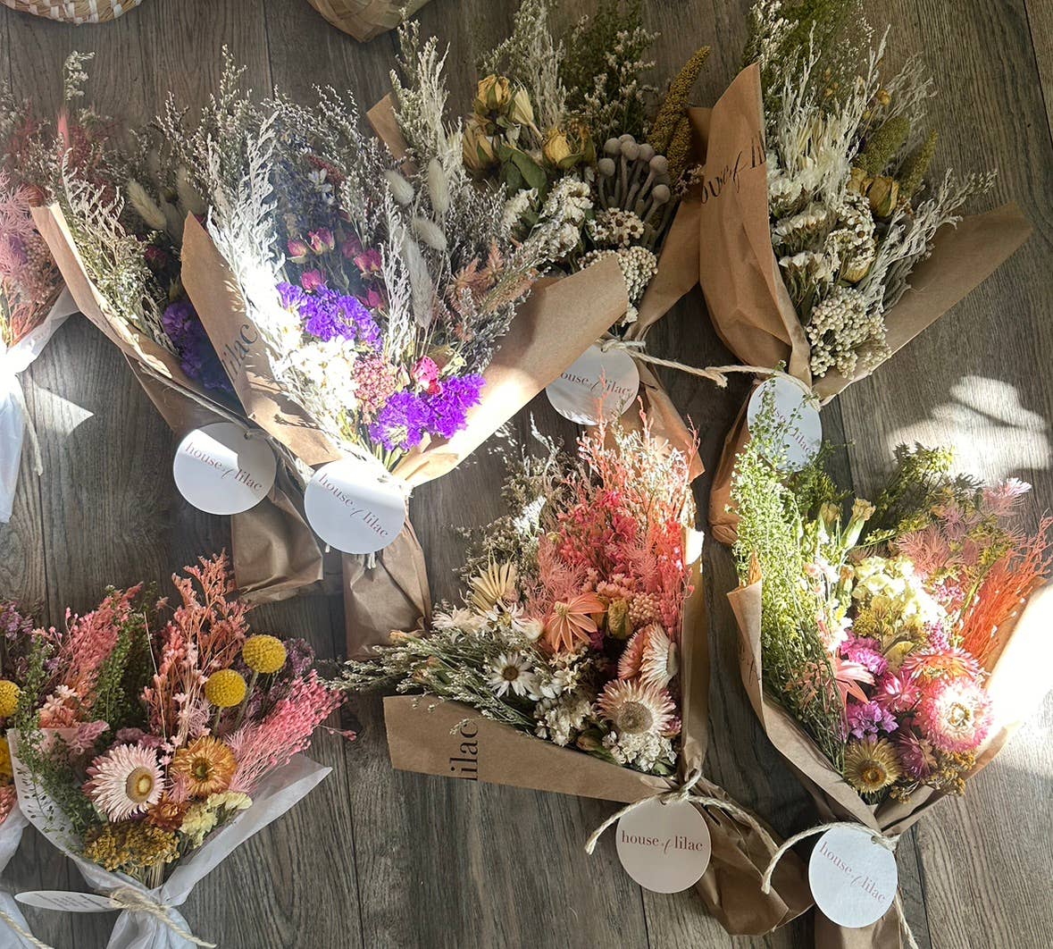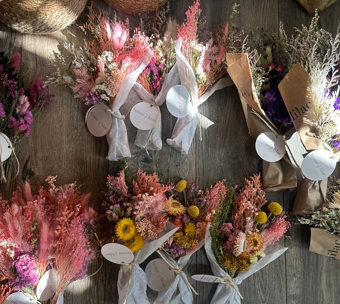 Hej heminredning! Den här torkade blomsterbuketten har en perfekt storlek för en liten vas hemma. Vår traditionella petite torkade blomsterbukett kommer i fem unika färgkombinationer och är en perfekt blandning av torkade och/eller konserverade blommor tillsammans med andra säsongsbetonade texturer. Våra torkade blommor är riktiga blommor som antingen torkats internt eller genomgått en konserveringsprocess. De är alltså äkta, bara torkade och eviga, vilket ger vilken plats som helst känslan av riktiga blommor utan behov av skötsel eller vatten. Buketten mäter cirka 20-23 cm i bredd och cirka 30 cm i höjd. Välj mellan: - romantisk: för rosa och vita nyanser. - moody: för blå, djupt rosa och lila nyanser. - ljus: för gula, ljusrosa och orange nyanser. - nude: för vita och beige nyanser. - sherbet: för pastellblå, orange, lila och rosa nyanser. Observera: våra torkade blommor kan variera från vecka till vecka och beror på säsong, så våra buketter skiljer sig troligtvis från de som visas.