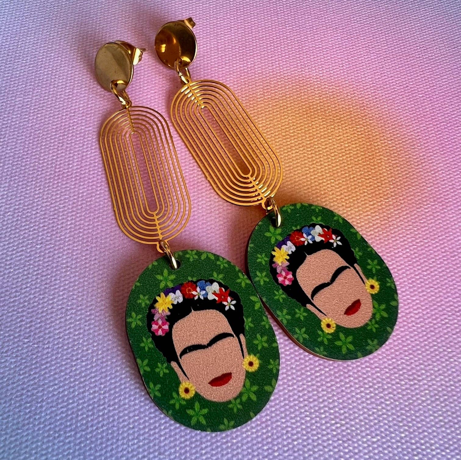 Örhängen med vita ovala akryldelar, mintgrön del med prickar och guldfärgat löv. Guldpläterade, hypoallergena stift.